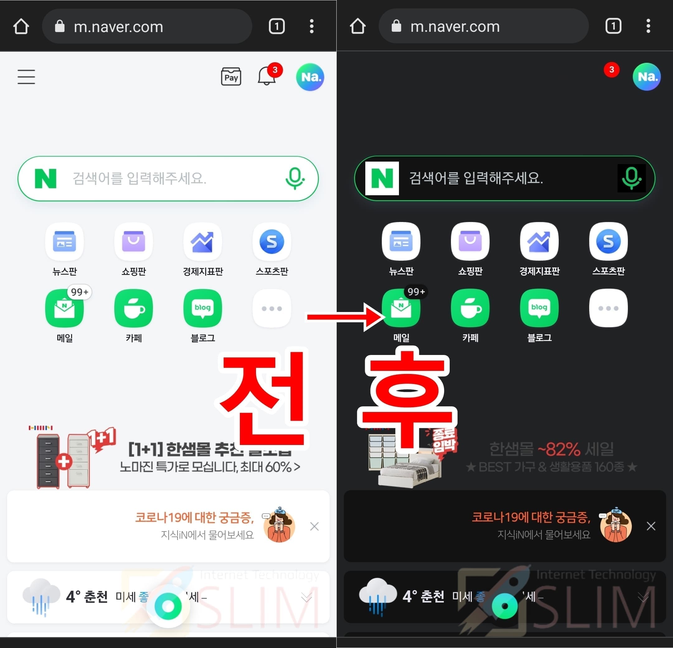 위의 사진은 전/후 비교사진인데요. 크롬 앱 설정에서 어둡게 테마를 적용해도 네이버 웹컨텐츠 화면에서는 다크모드로 보여지지 않았지만 flags를 이용하니 완벽하게 웹컨텐츠 영역화면도 다크모드로 적용된 모습입니다. 이처럼 크롬에서 다크모드로 사용하기 위해선 필수적인 기능이니 다른 방법과 함께 꼭 설정하시길 바랍니다.