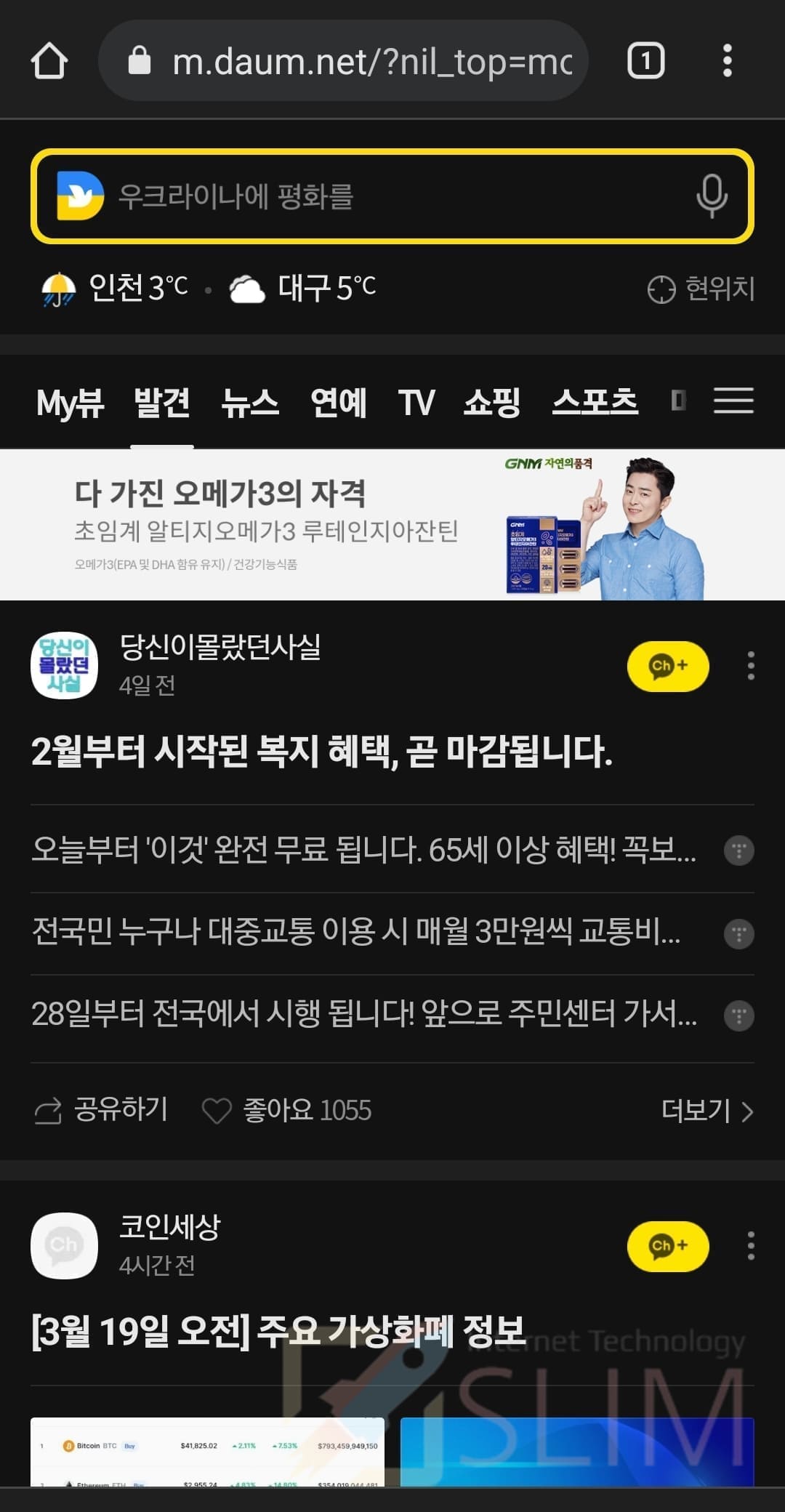 ▲ 모바일 크롬을 확인해보아도 다크모드로 잘 적용된 모습입니다. 단, 위의 다른 방법들과 마찬가지로 웹 컨텐츠영역이 다크모드로 바뀌지 않을 수 있으니 크롬flgs 설정을 함께 적용하시길 바랍니다.