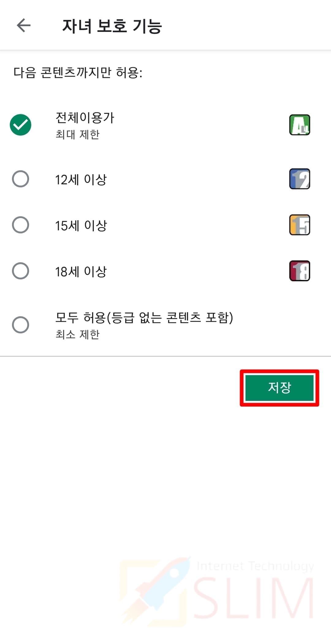 14. 플레이 스토어 모든 컨텐츠에서 자녀보호 기능이 설정됩니다.