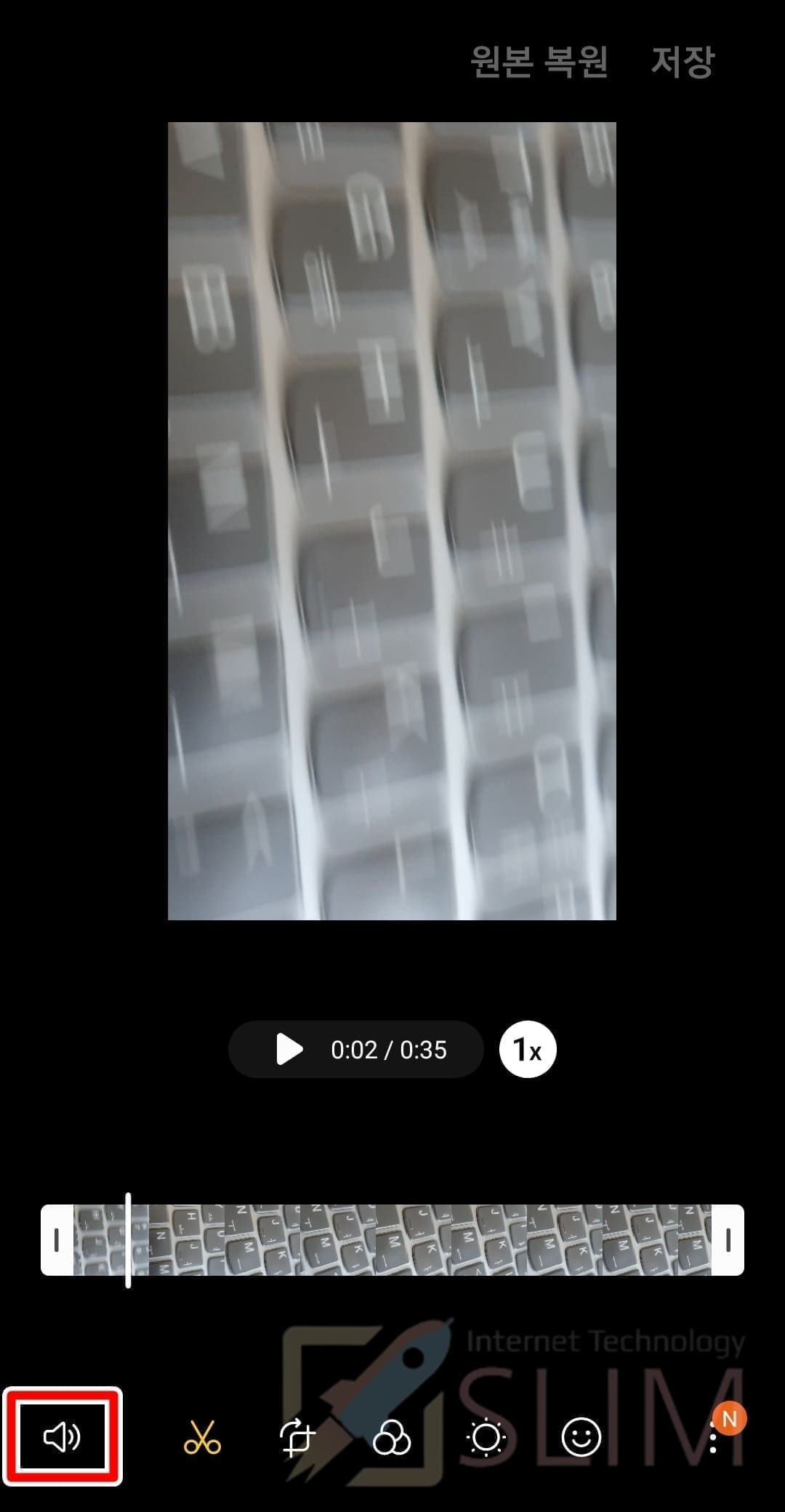 드래그바가 좌측으로 갈수록 소리가 작아지고, 우측으로 갈수록 소리가 커집니다. 기본적으로 우측 끝까지 설정되어 있는데요. 이 바를 조절해서 동영상 소리를 줄여주거나 끝까지 왼쪽으로 설정하여 음소거시킬 수 있습니다. 참고로 슬러시 스피커 모양이 된 것으로 동영상 소리가 제거된 것을 확인할 수 있습니다.