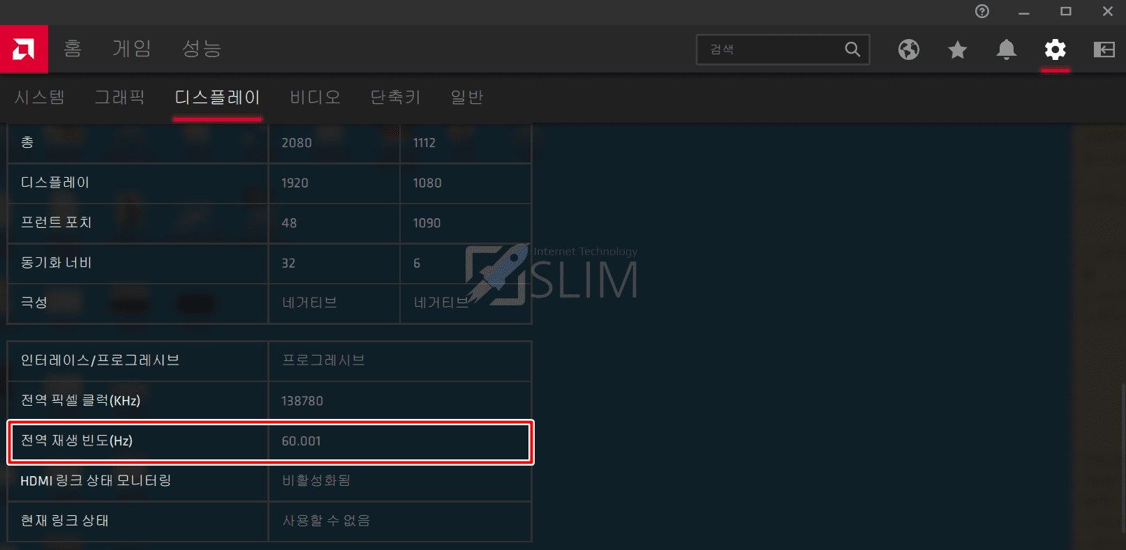 4. 전역 재생 빈도(Hz)로 모니터 주사율을 확인합니다.