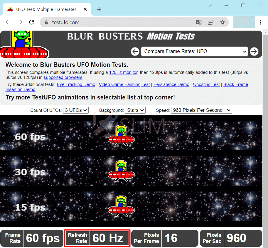 초기에는 3개의 UFO가 나오면서 주사율을 테스트하는데 만약 자신의 모니터가 60HZ 정도의 주사율을 가지고 있다면 초기 설정으로는 확인이 불가능합니다. 따라서 UFO 수를 2개로 줄여주시면 되며 백그라운드나 스피드를 조절해보시면 쉽게 본인 보니터 주사율을 확인할 수 있을 것입니다. 저의 경우 60HZ임을 곧바로 알 수 있었네요.