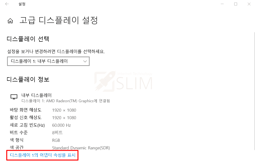 5. 디스플레이 1의 어댑터 속성을 표시를 클릭합니다.