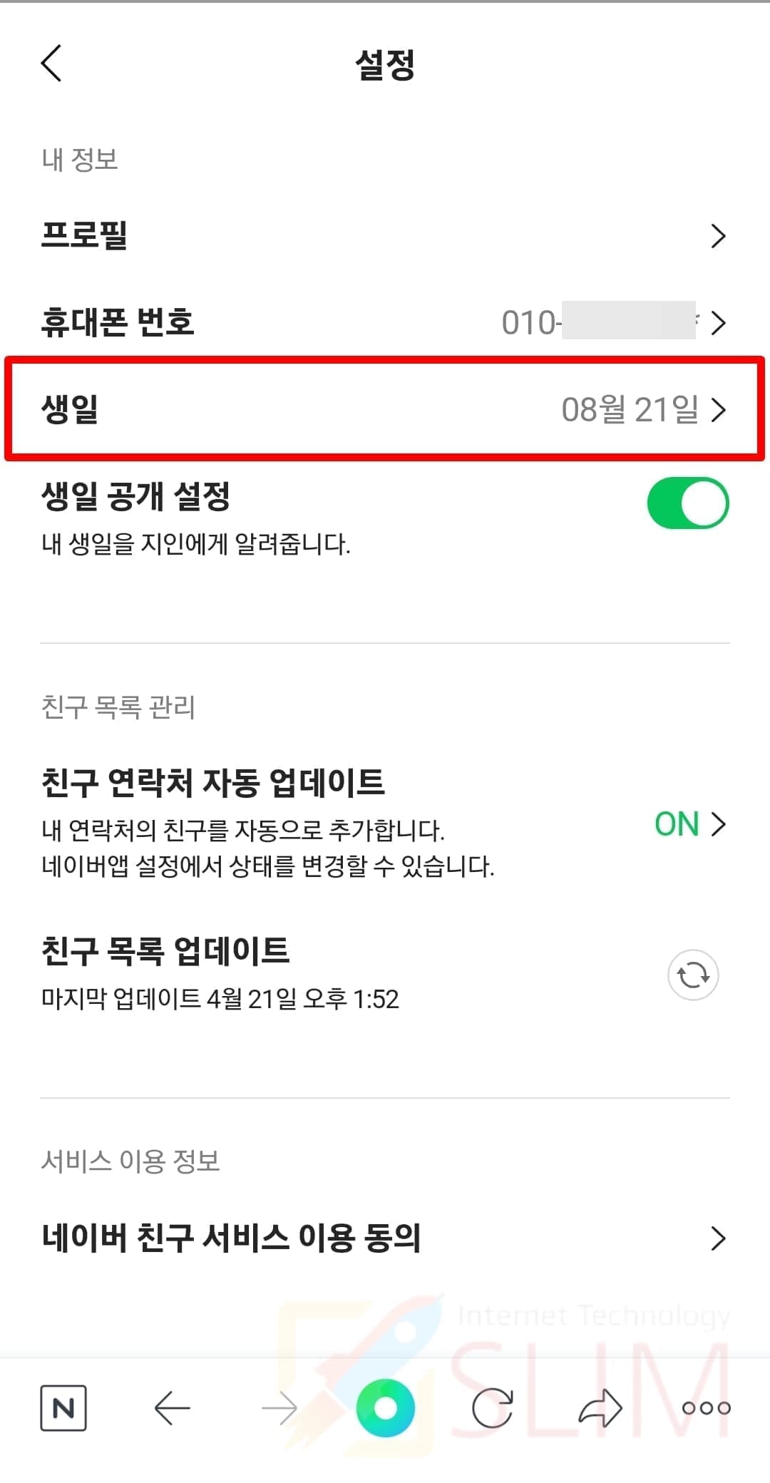 토글바가 왼쪽으로 움직이며 회색으로 바뀐 것이 비활성화된 것입니다. 이제 내 생일이 네이버 친구들에게 알림으로 가지 않습니다.