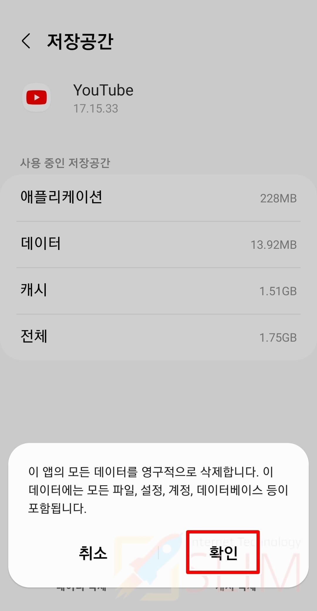 이 앱의 모든 데이터를 영구적으로 삭제합니다. 데이터에는 모든 파일, 설정, 계정, 데이터베이스 등이 포함됩니다라는 팝업이 뜨는데요. 이렇게 유튜브 앱에서 지워지는 데이터는 불필요한 캐시정보들만 지워지기 때문에 나의 유튜브 계정 설정이나 기능이 삭제되어 초기화되진 않습니다. 전혀 문제가 없기 때문에 데이터 삭제를 진행해주시면 되겠습니다.