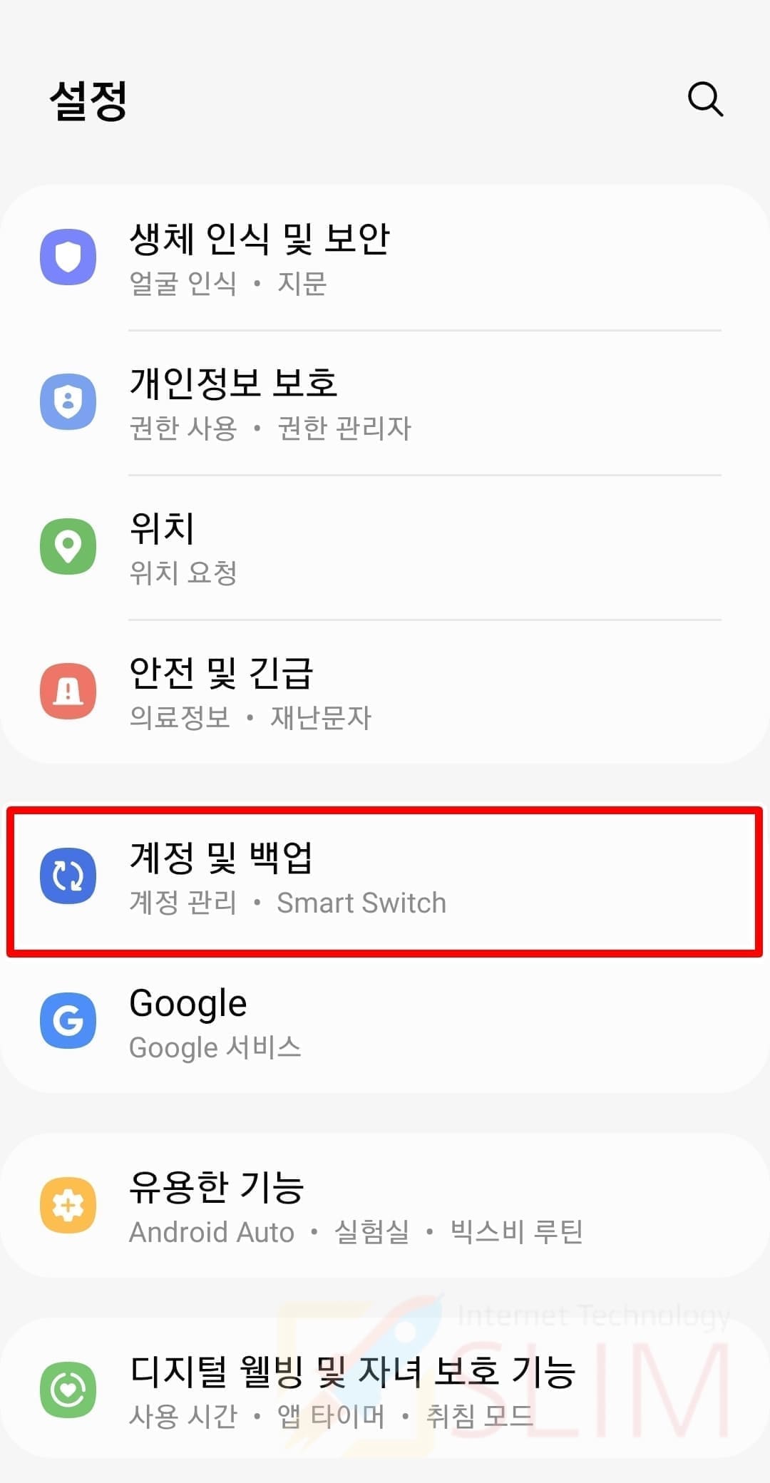 2. 계정 및 백업을 누릅니다.