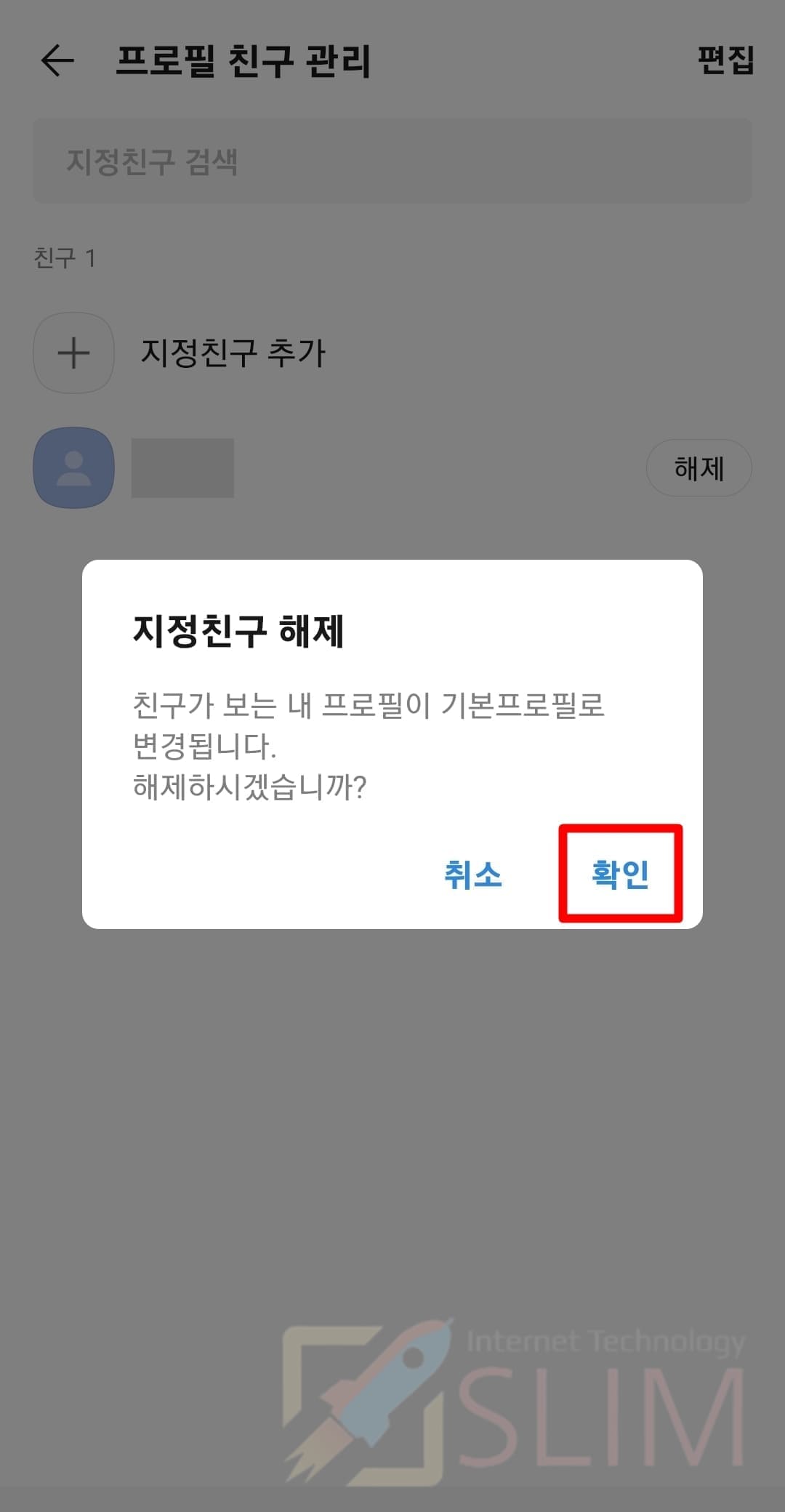 5. 지정친구 해제 팝업에서 확인을 누릅니다.