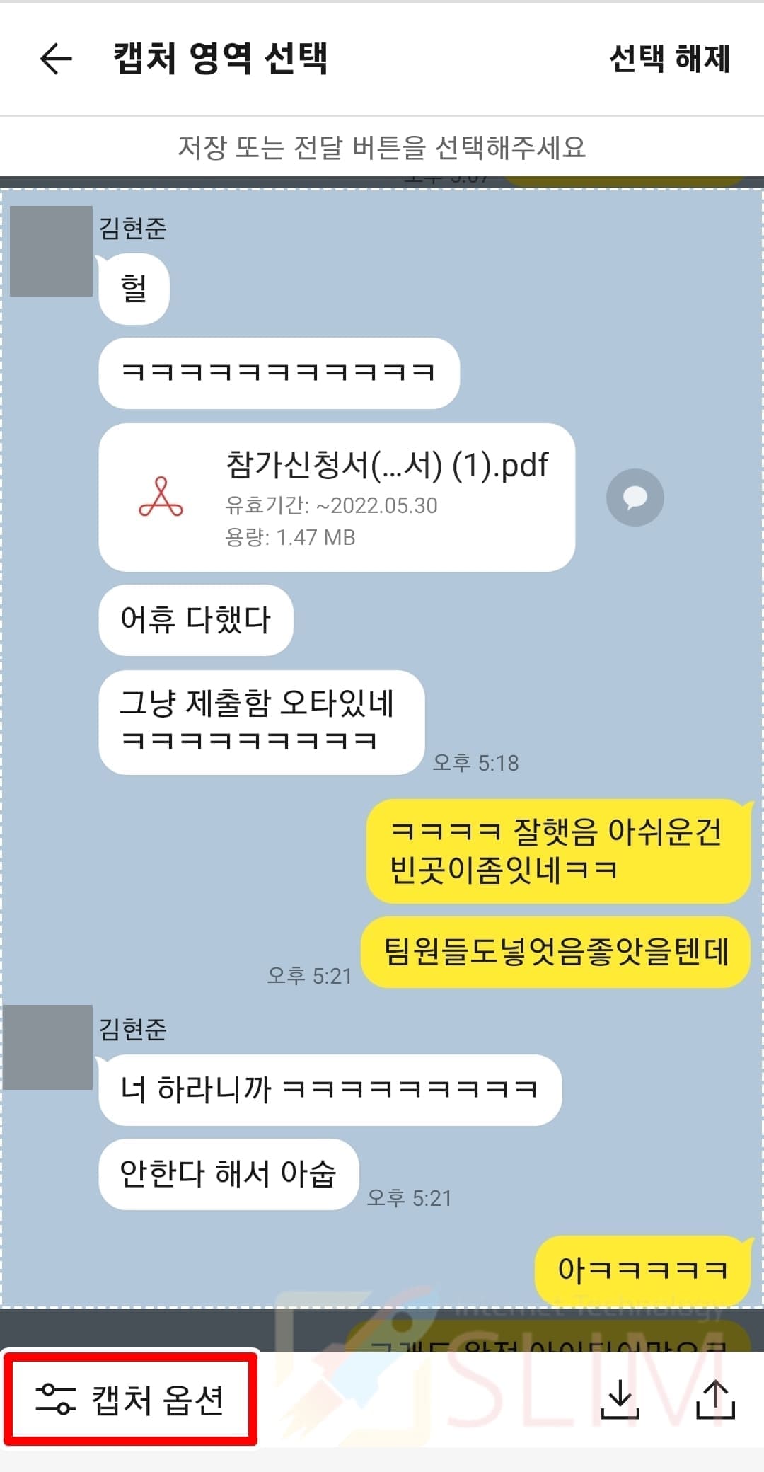 보통 카카오톡 캡처하는 방법을 이용하는 경우는 상대방과의 채팅방 내의 대화내용을 저장하기 위해서입니다. 이 때 긴 대화나 익명으로 저장시키고 싶을 때가 많기에 위 사진처럼 편리하게 캡쳐하여 사용할 수 있습니다.
