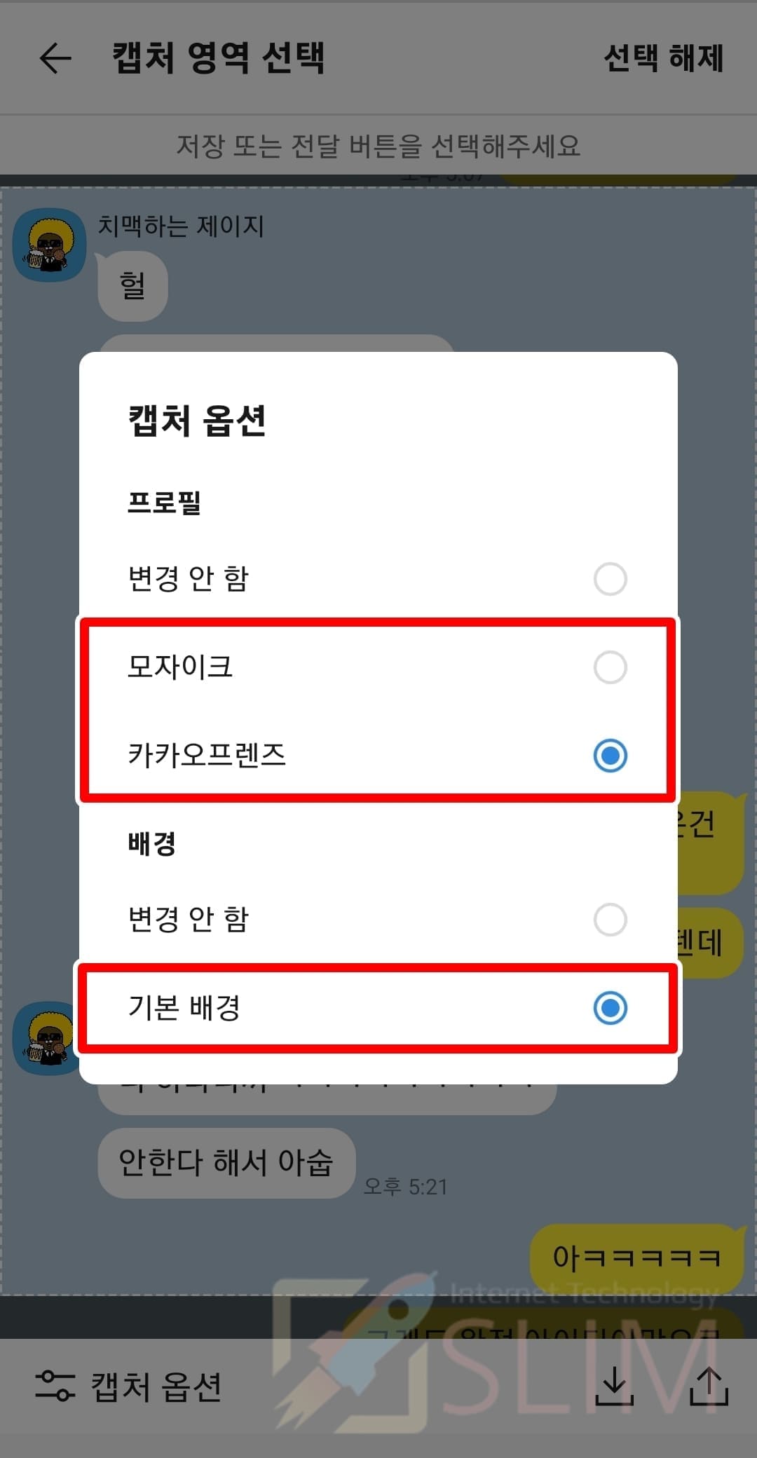 기능을 선택하면 뒤에 보여지는 캡처 영역이 변경됩니다. 예를 들어서 모자이크를 누르면 상대방 프로필 사진이 모자이크 처리되고 카카오프렌즈를 선택하면 임의의 카카오프렌즈 이름과 프로필사진으로 변경됩니다. 배경의 경우 본인이 직접 지정한 사진으로 설정한 경우 기본 배경을 누르면 카카오톡의 기본 배경 디자인으로 바꿔서 캡처 사진이 저장됩니다.
