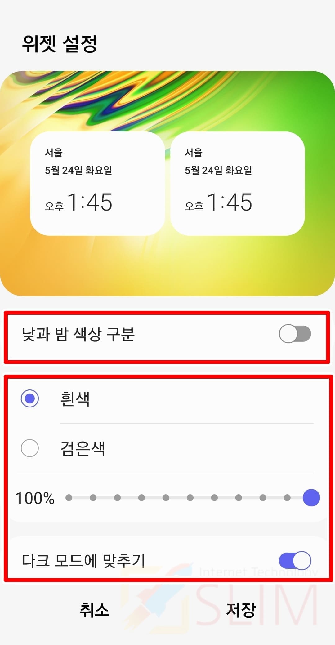 6. 시계 위젯 색상과 다크모드 적용 유무를 선택합니다.