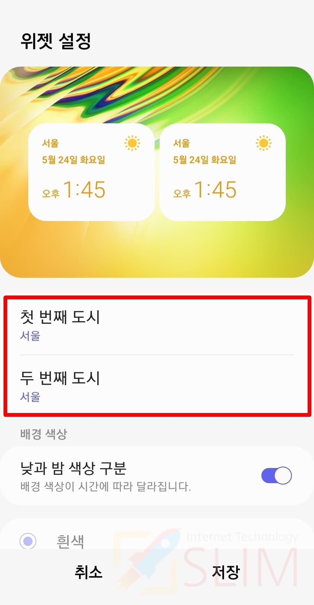 4. 위젯 설정 화면에서 첫번째 도시 및 두번째 도시를 확인합니다.