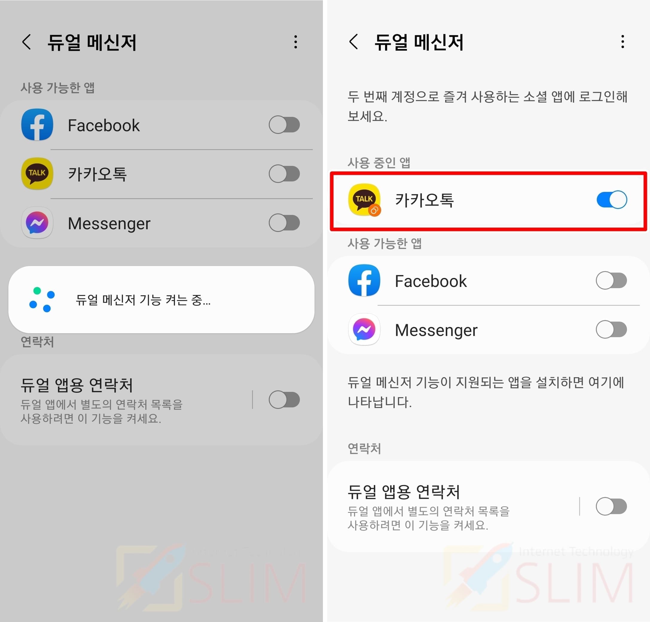 카톡이 아닌 페이스북, 인스타그램 등의 타 SNS앱도 계정 두개로 사용이 가능합니다. 사용하고 싶다면 이곳에서 마찬가지로 활성화해주시면 됩니다.