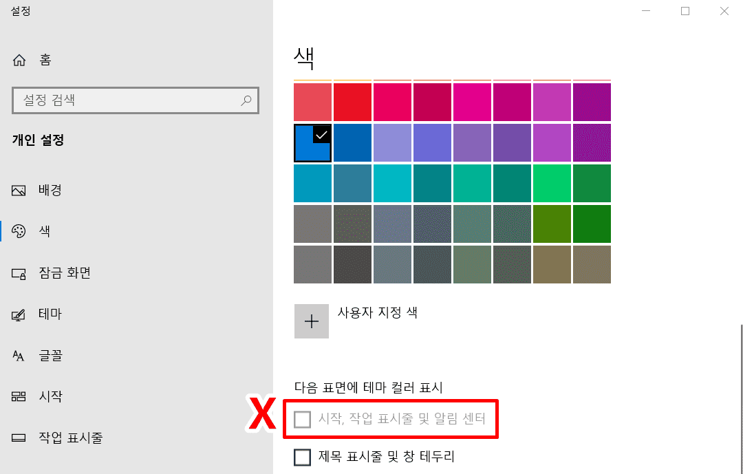 위의 윈도우10 작업표시줄 색상 변경 방법을 다시 따라하셔서 색을 골라서 설정하시면 됩니다.