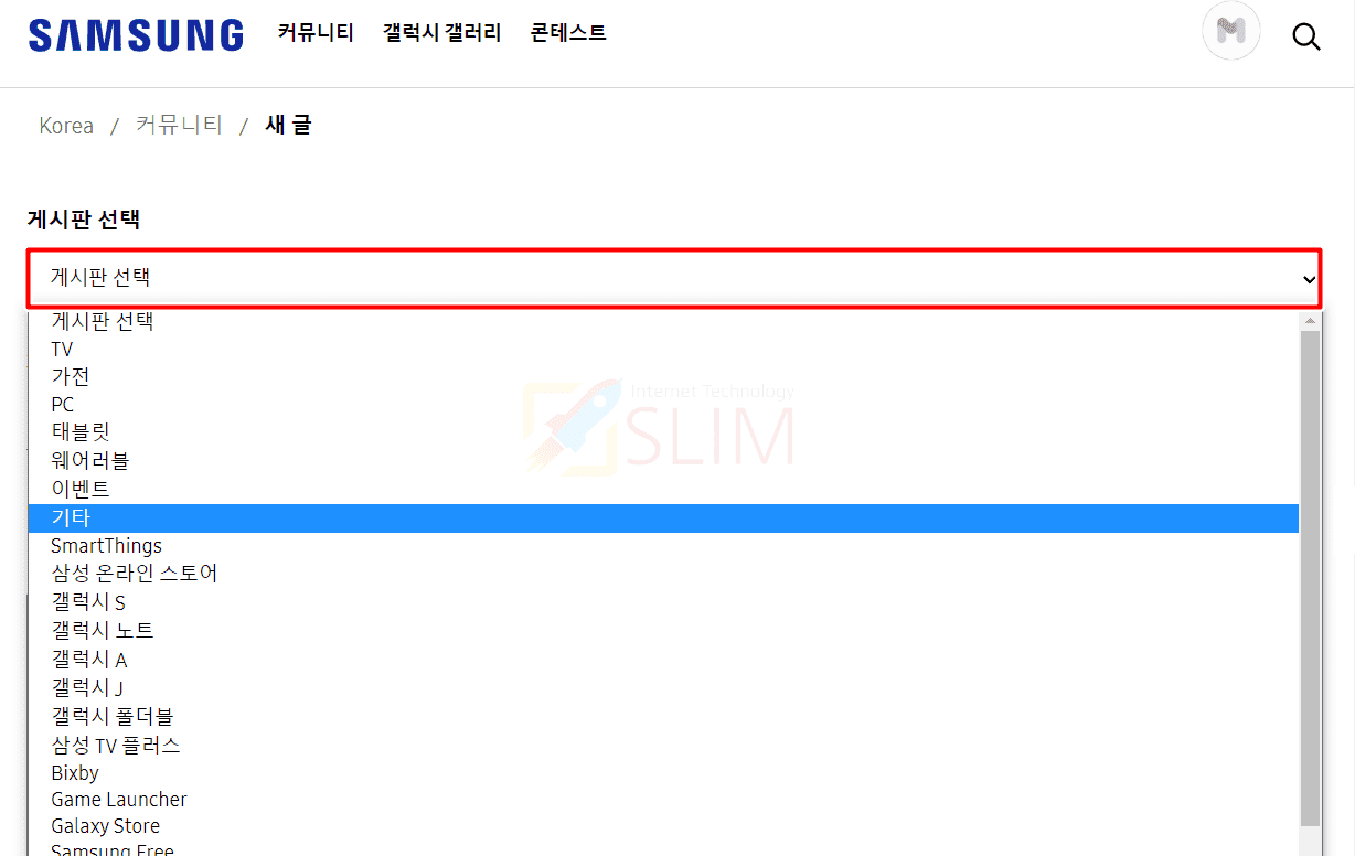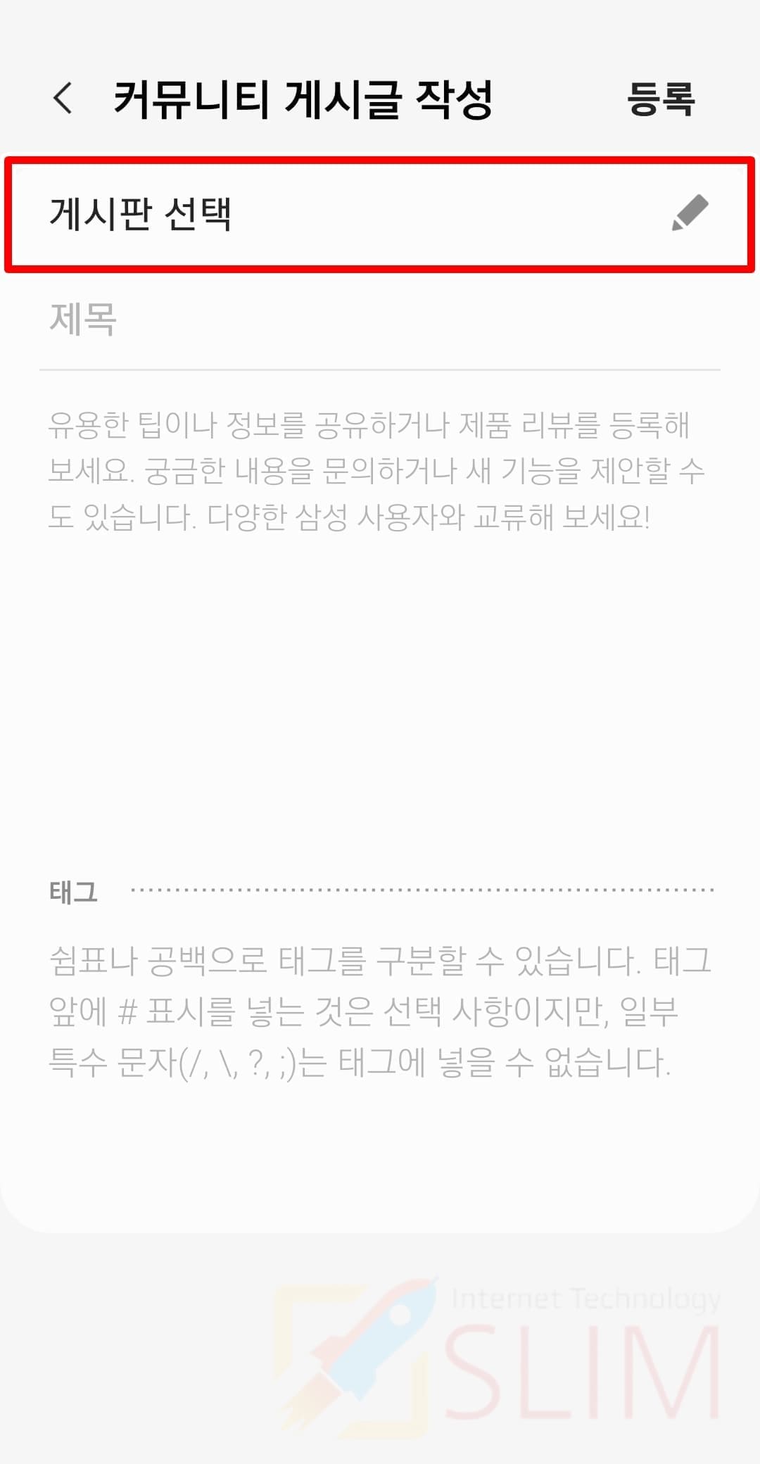 7. 커뮤니티 게시글 작성 화면에서 게시판 선택을 클릭합니다.
