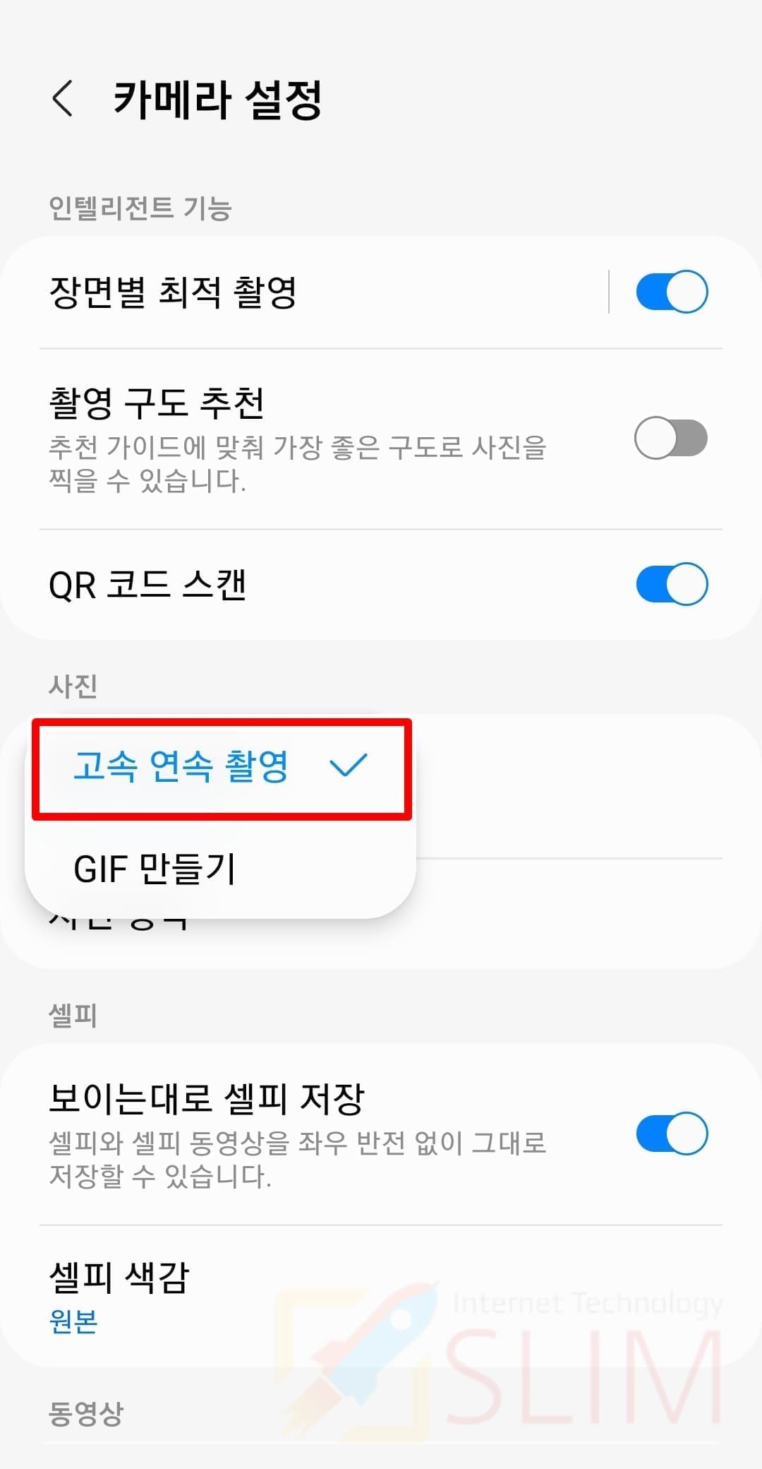 2. 연속 촬영 기능을 찾아서 선택합니다.