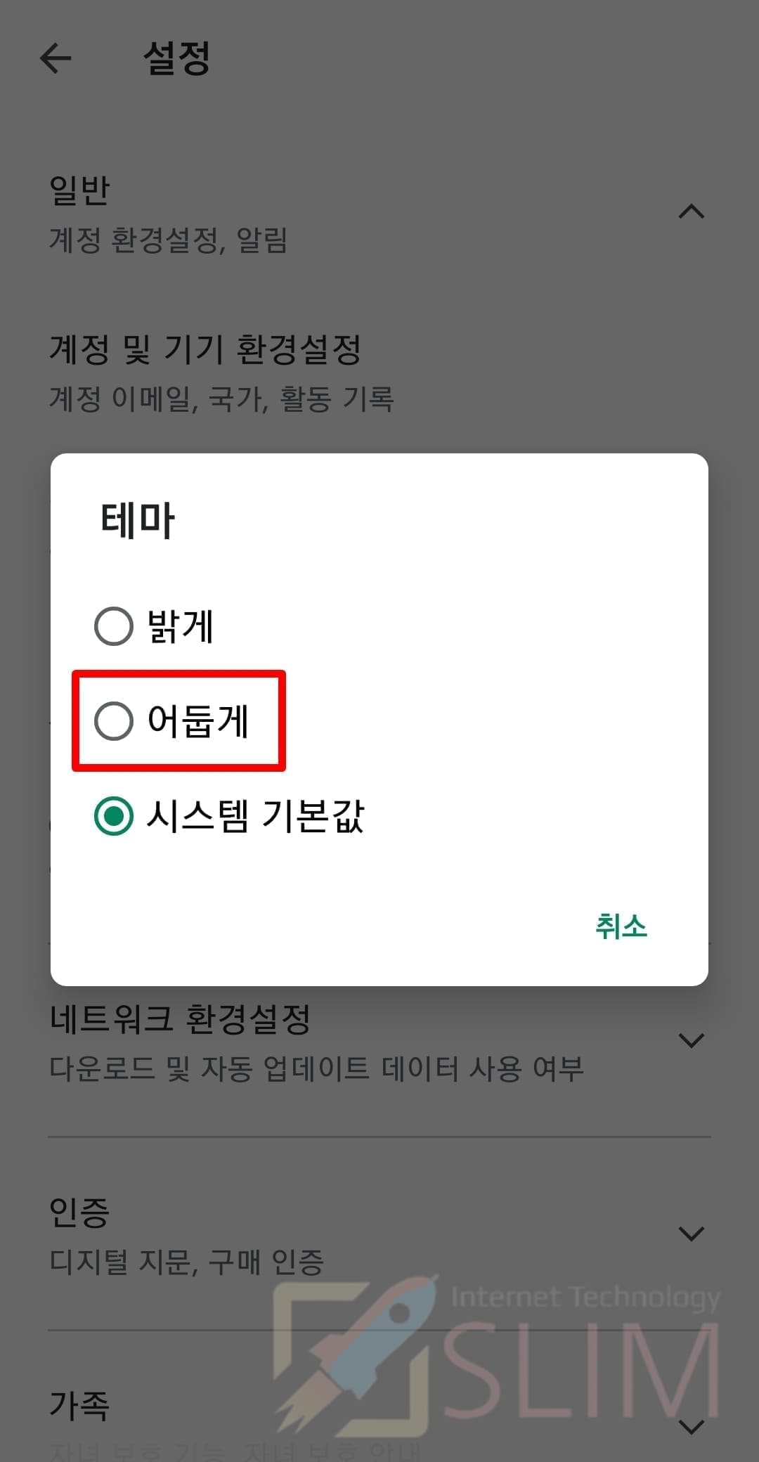 6. 테마에서 어둡게를 체크 선택합니다.