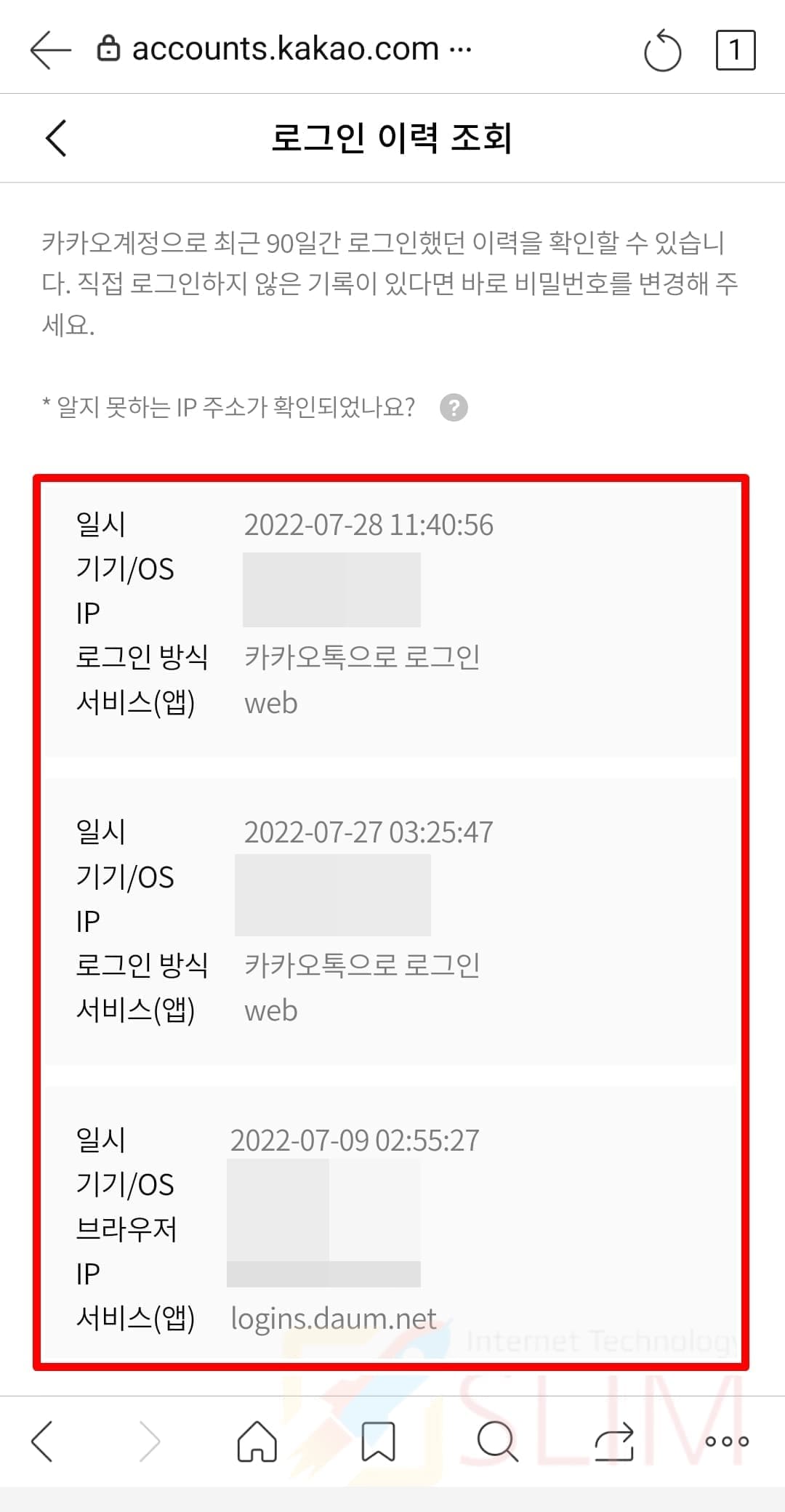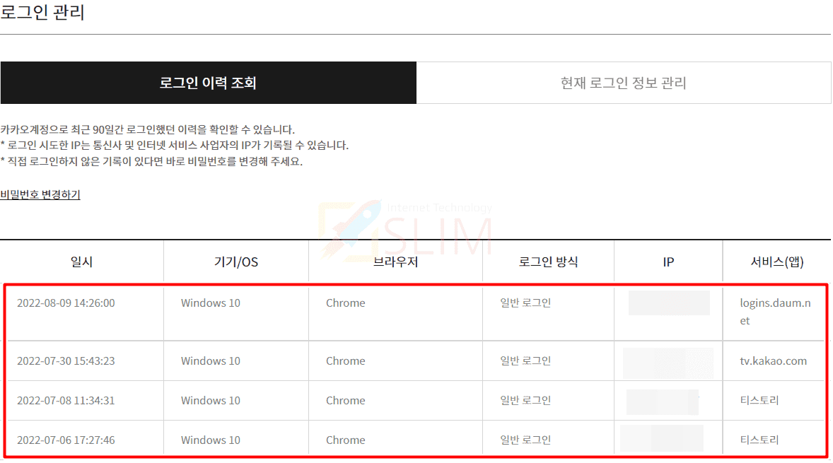 안녕하세요. 오늘은 다음 로그인 기록 조회 및 삭제 방법을 소개드리도록 하겠습니다. 다음은 카카오(KAKAO)와 통합된 이후 포털사이트부터 티스토리 등의 서비스까지 모두 카카오 계정으로 로그인되고 있습니다. 그래서 PC나 모바일 어플에서 다음에 로그인을 하면 모두 카카오 계정에 로그인 기록이 남게 되는데요. 우리가 그래서 조회할 수 있는 정보로 일자와 시간, 접속한 기기 정보, IP 등을 모두 확인할 수 있습니다.
