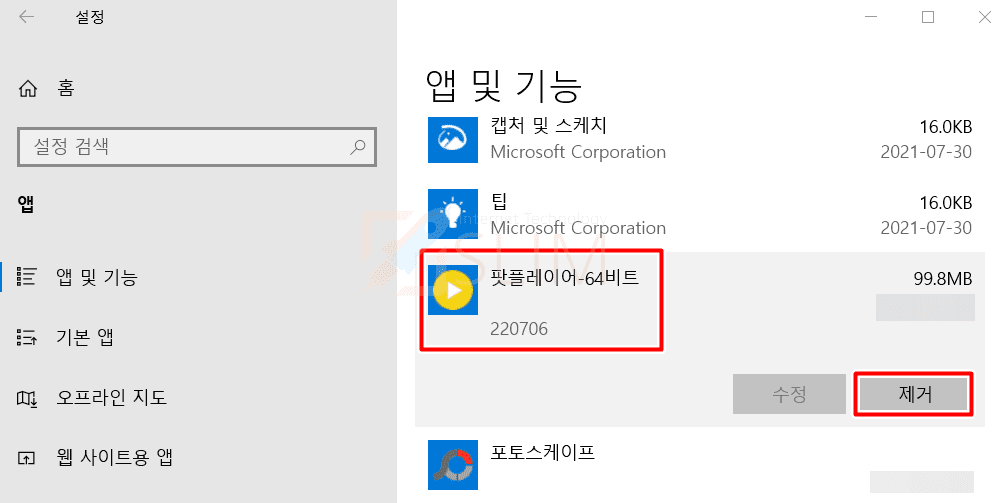 3. 팟플레이어를 찾은 뒤 제거를 클릭합니다.