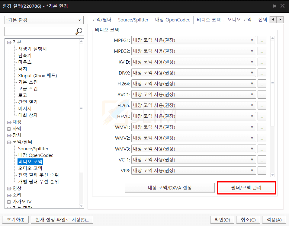 4. 필터/코덱 관리를 클릭합니다.