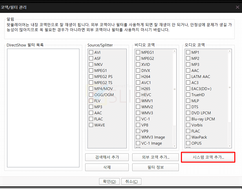 5. 시스템 코덱 추가를 누릅니다.