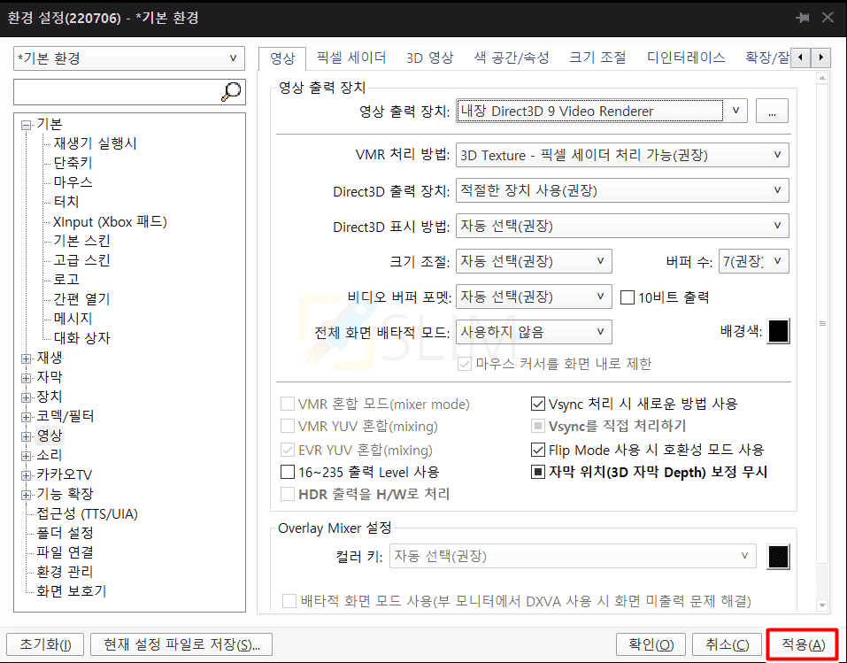 5. 영상 출력 장치를 누르고 내장 Direct3D 9 Video Renderer로 선택합니다.