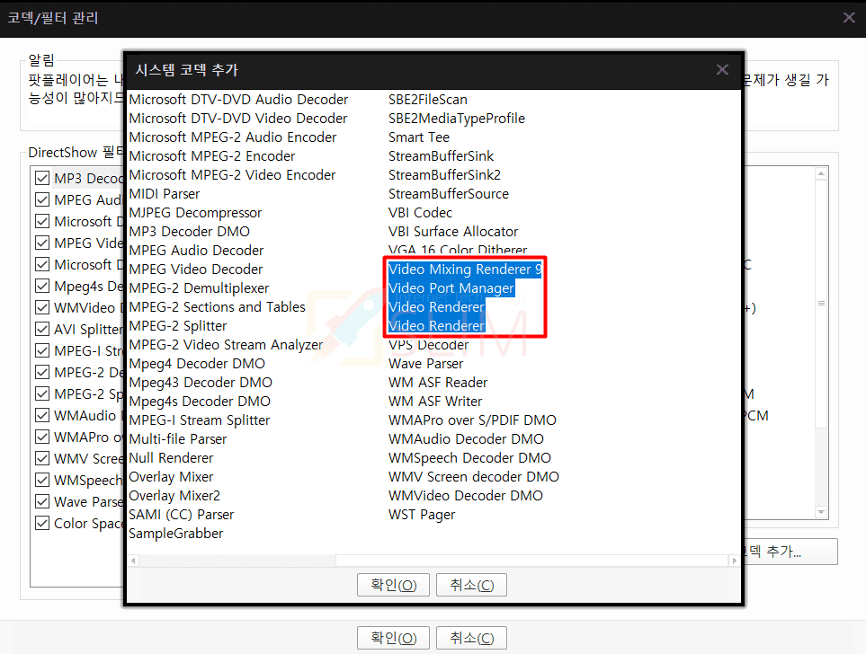 코덱을 중복 선택하는 방법은 Video 코덱을 하나 누른 후 키보드 자판에서 CTRL 키를 계속 누른상태로 다른 Video 코덱을 연달아 눌러주시면 중복 선택됩니다. 선택해서 추가해야하는 코덱은 Video Mixing Renderer 9, Video Port Manager, Video Renderer(1), Video Renderer(2) 입니다.