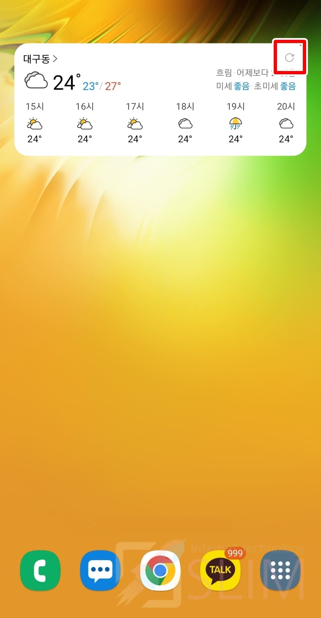 다음 날씨 위젯을 확인할 때 시간이 맞지 않는다거나 동기화가 되지 않아 부정확한 정보를 보여준다면 직접 수동으로 실시간 동기화를 시킬 수 있습니다. 다음 날씨 위젯의 우측 상단의 [새로고침] 버튼을 눌러주시면 됩니다.