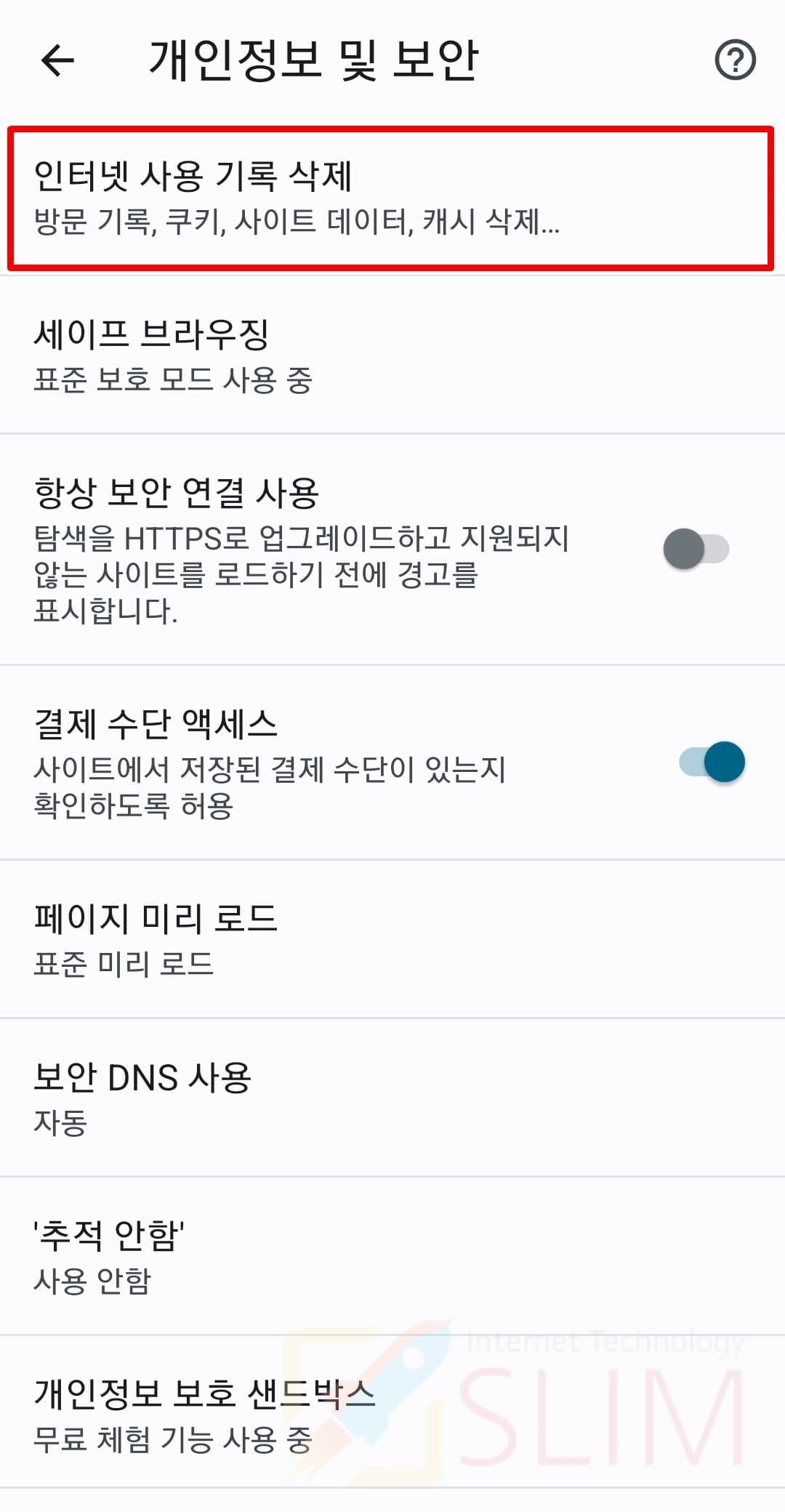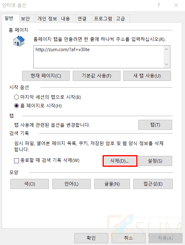 5. 인터넷 사용 기록 삭제를 누릅니다.
