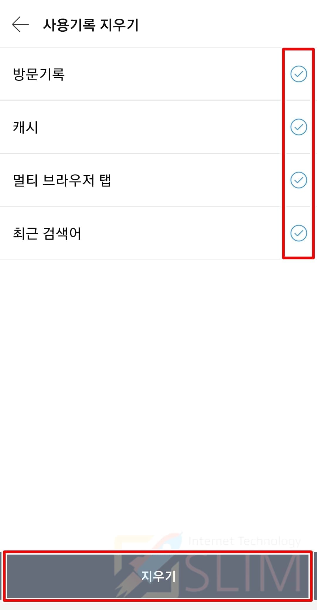6. 방문기록, 캐시, 멀티 브라우저 탭, 최근 검색어를 모두 체크합니다.