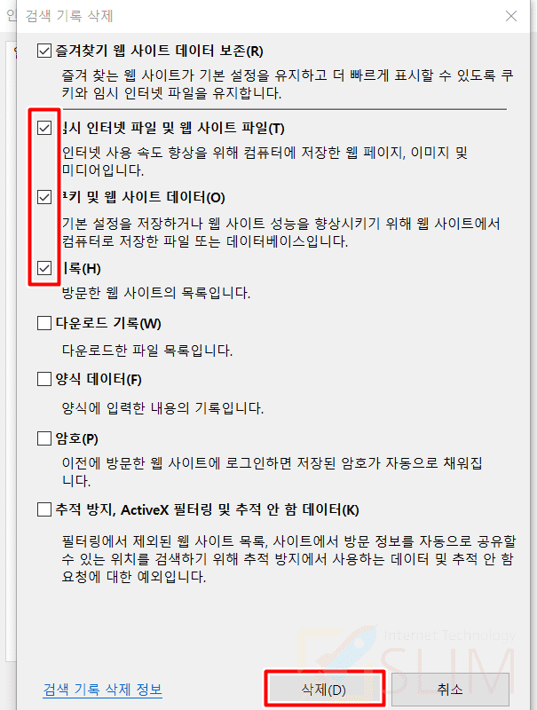 8. 인터넷 사용 기록 삭제를 클릭합니다.