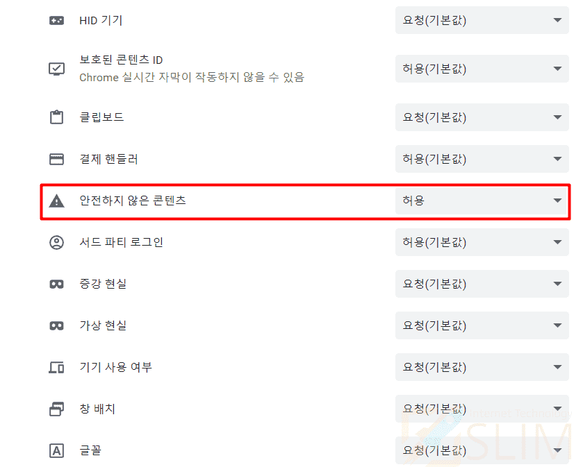 6. 안전하지 않은 콘텐츠를 찾은 후 허용으로 변경합니다.