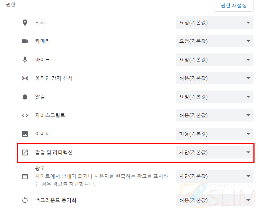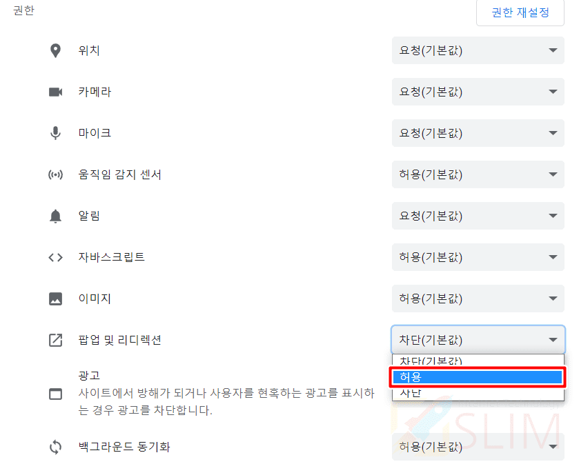 5. 차단(기본값)을 허용으로 변경합니다.