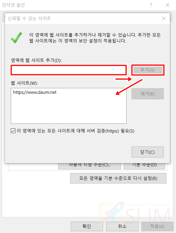 6. PC 인터넷 익스플로러에서 다음을 신뢰할 수 있는 사이트 등록하기