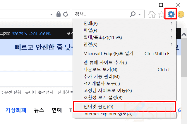 1. 익스플로러 > 톱니바퀴 설정 버튼 > 인터넷옵션을 클릭합니다.