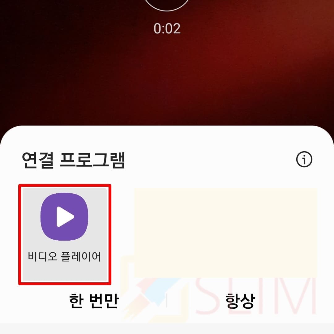 비디오 플레이어는 갤럭시 기본 동영상 재생 앱입니다. 따라서 이를 선택해주시면 되고 갤럭시가 아니라면 사용중인 스마트폰 제조사의 기본 동영상 앱을 선택해주시면 됩니다. 또한 팝업창에서는 한번만, 항상 선택 버튼이 보이는데 나중에 다른 동영상 앱을 사용할 것이 아니라면 '항상'을 체크해서 다음 동영상은 계속 기본 동영상 앱으로 실행되게 설정 후 사용하시길 바랍니다.