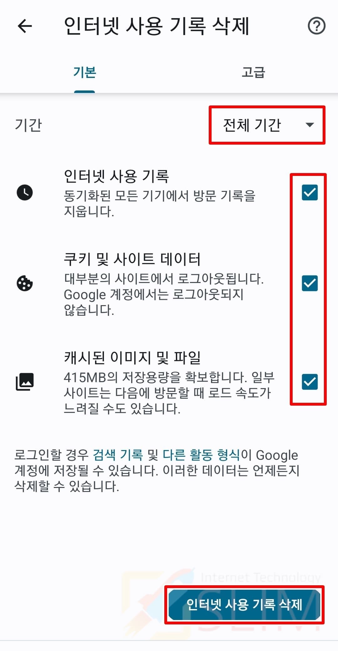 3. 파일, 데이터, 기록을 모두 체크하고 삭제합니다.