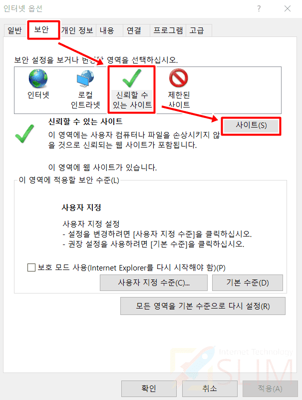 3. 보안 > 신뢰할 수 있는 사이트 > 사이트를 클릭합니다.