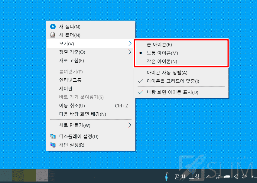 첫번째 방법은 바탕화면 보기 기능을 이용하는 것입니다. 키보드를 전혀 이용하지 않고 마우스로만 아이콘 크기를 조절하고 싶다면 유용하게 이용할 수 있습니다. 보기 기능으로는 3가지 크기 조절이 가능하니 참고하세요.