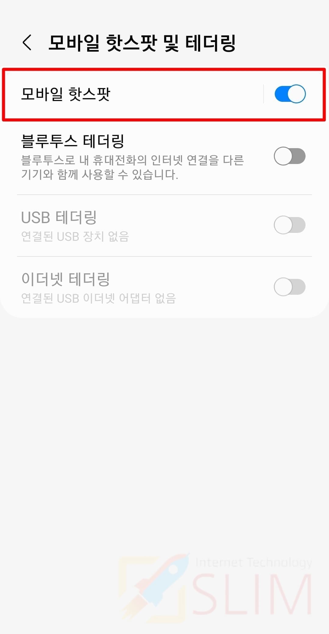 1. 스마트폰에서 모바일 핫스팟 화면을 실행합니다.