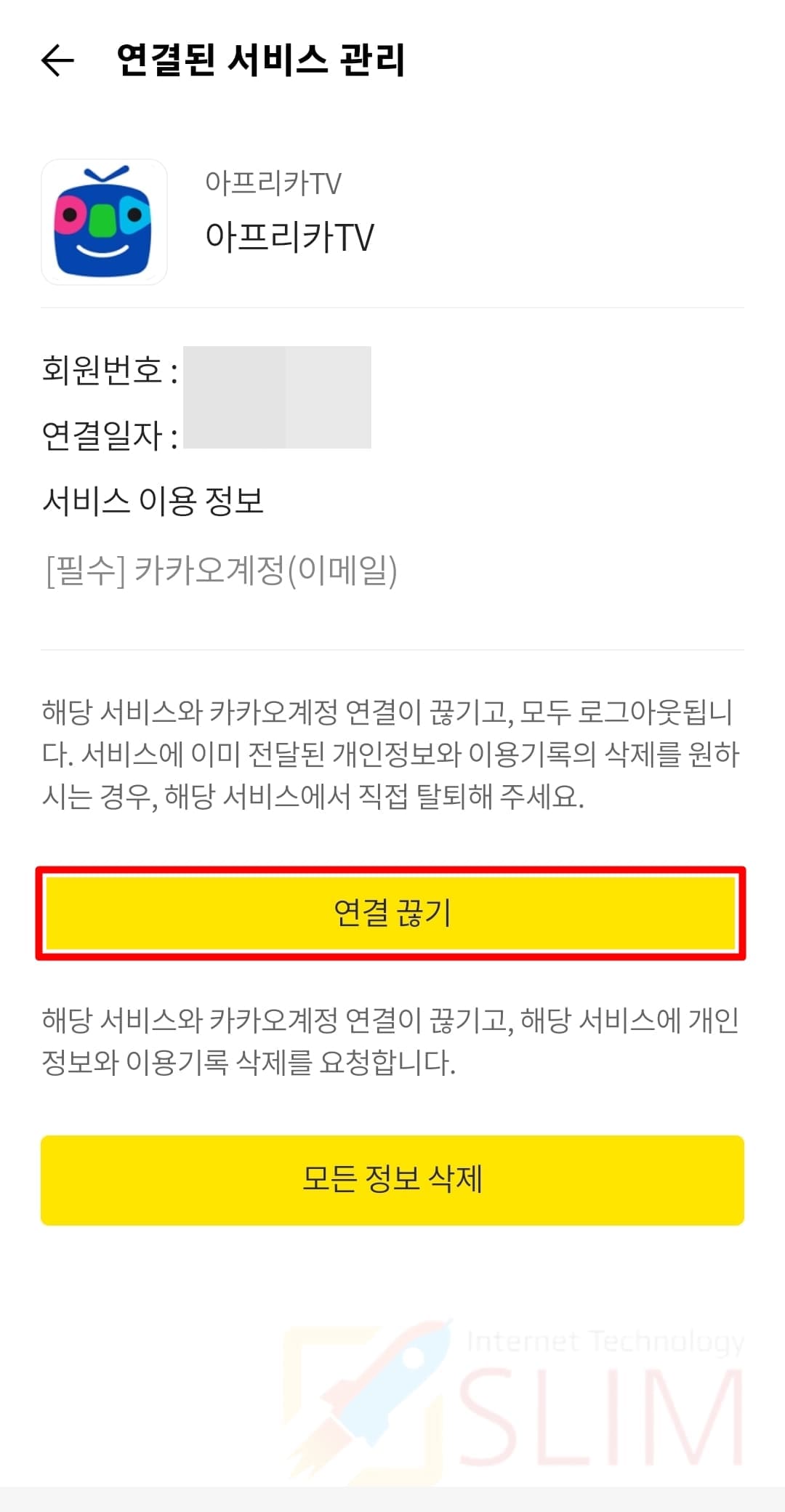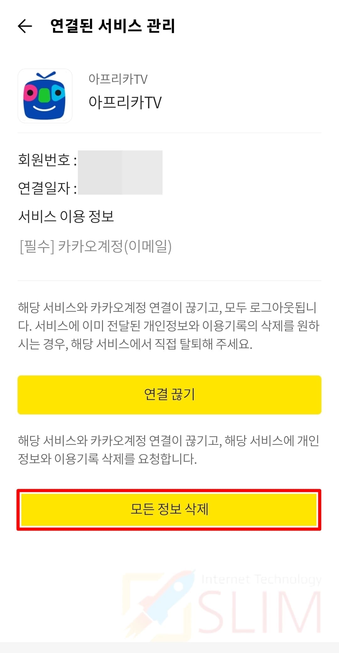 모든 정보 삭제시 해당 서비스와 카카오계정 연결이 끊기고 해당 서비스에 개인정보와 이용기록 삭제를 요청합니다.