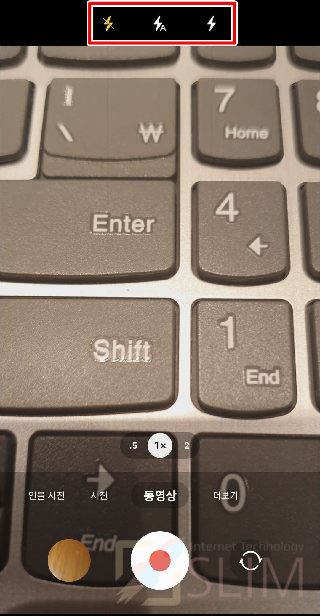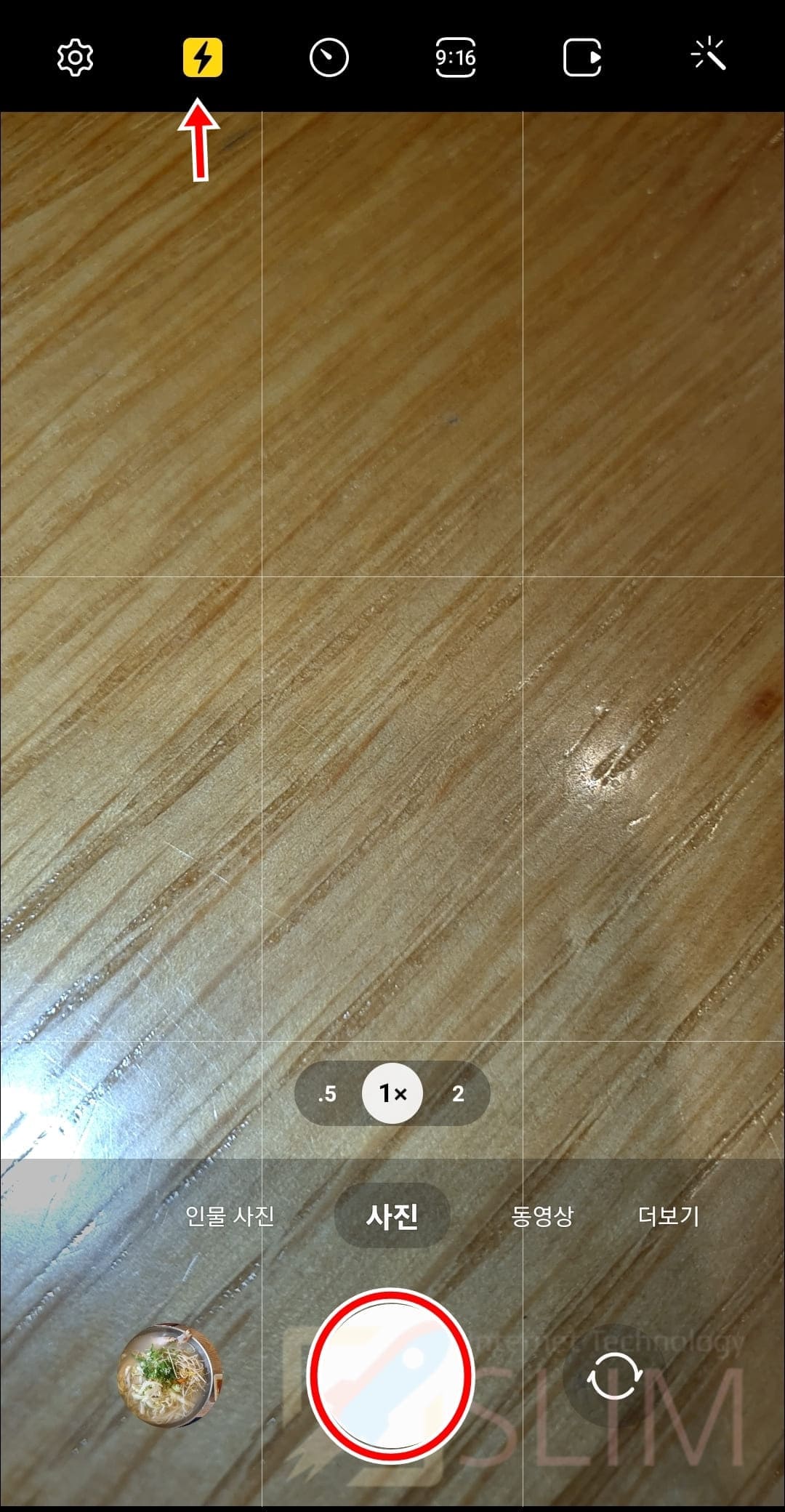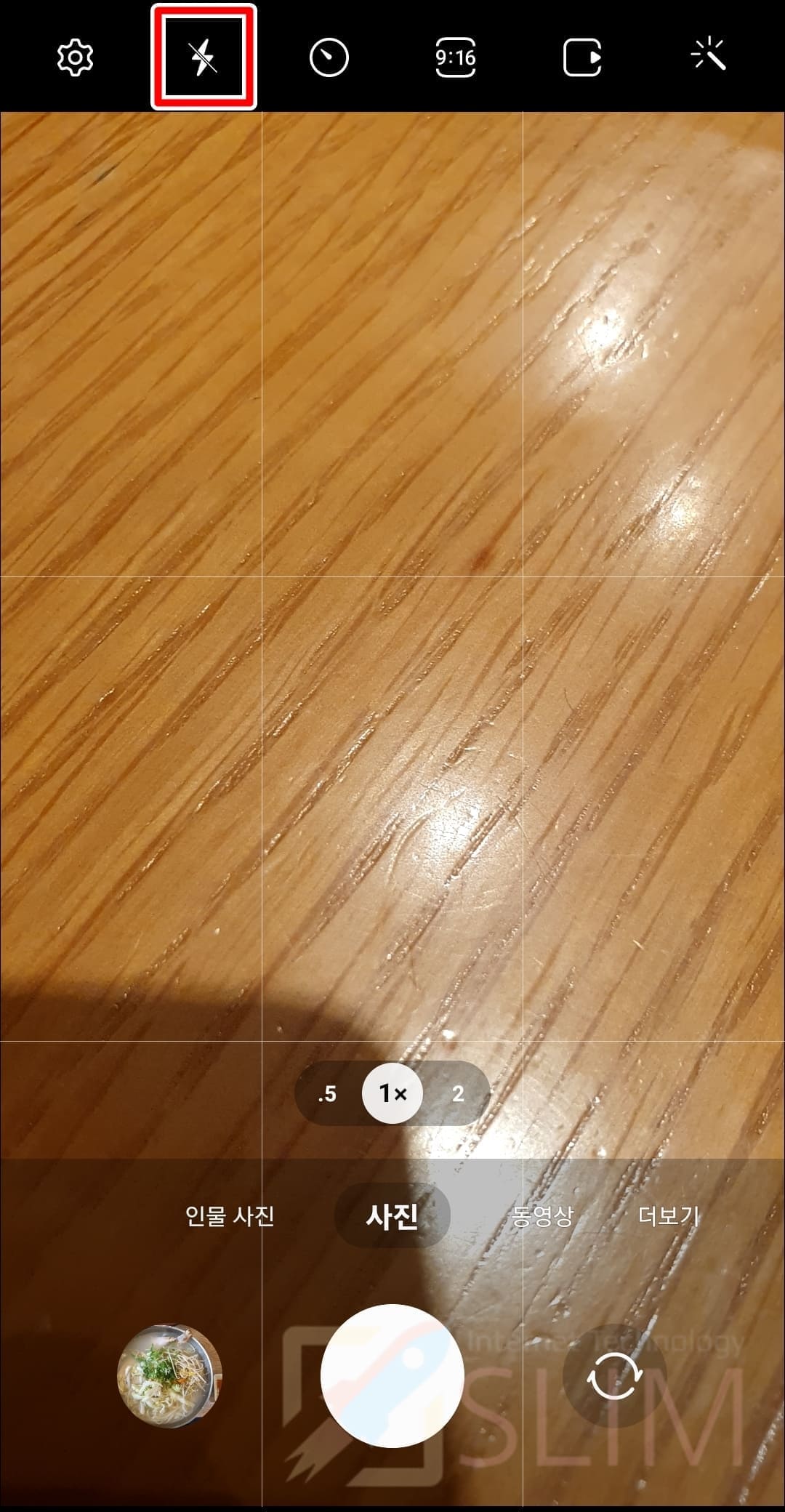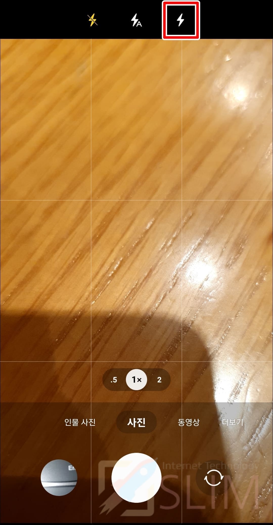 2. 상단에서 번개모양 플래시 메뉴를 터치합니다.