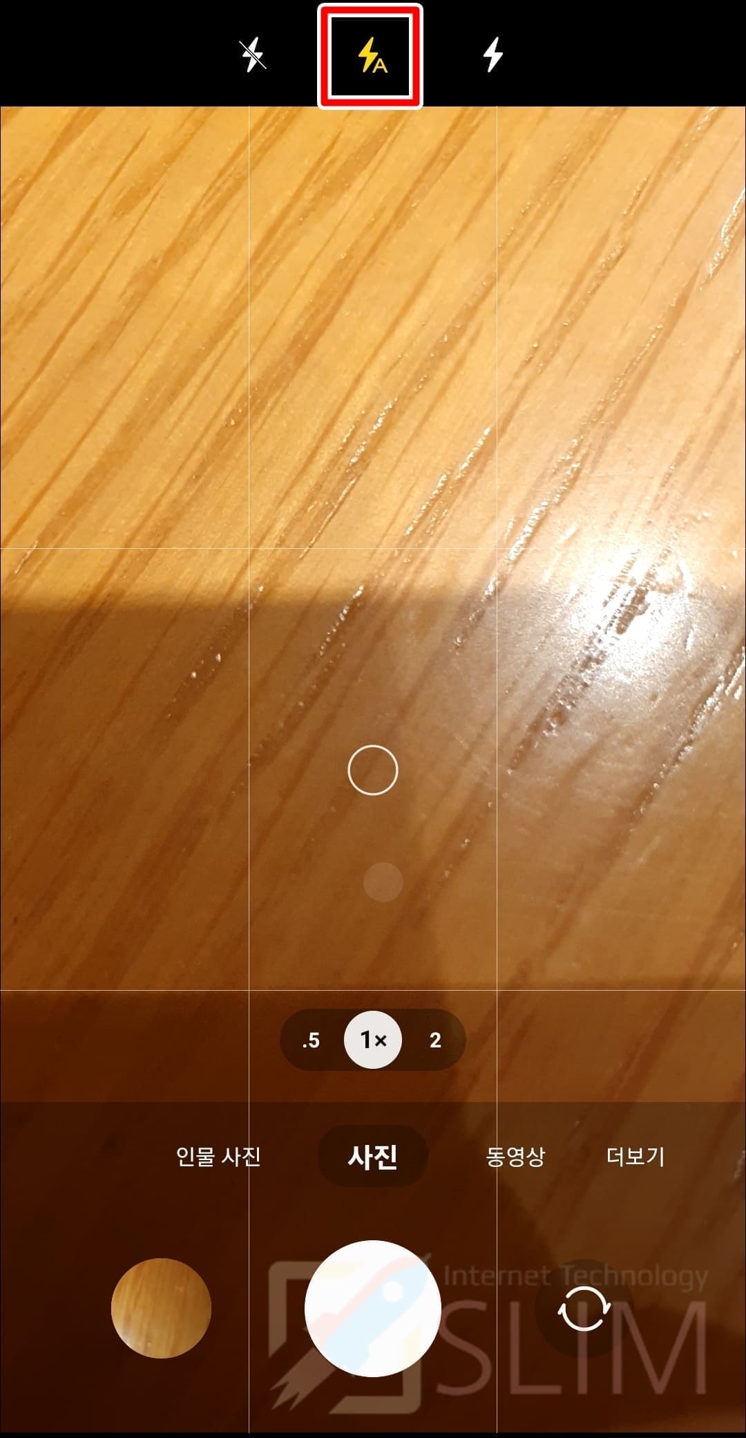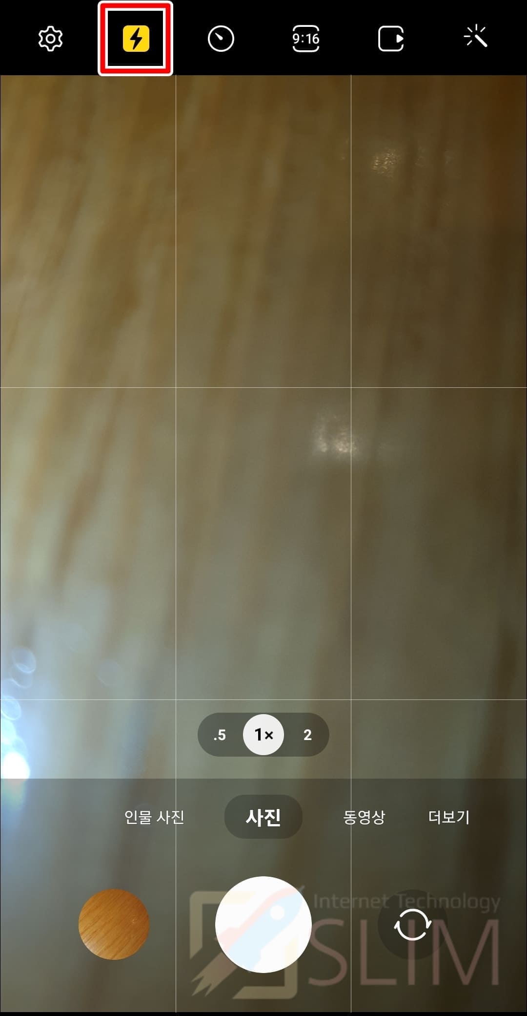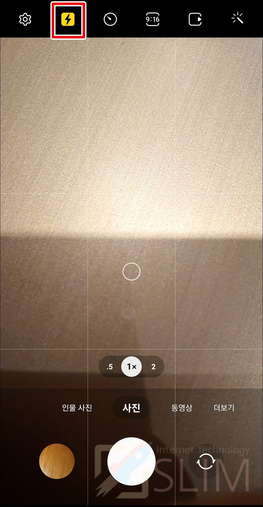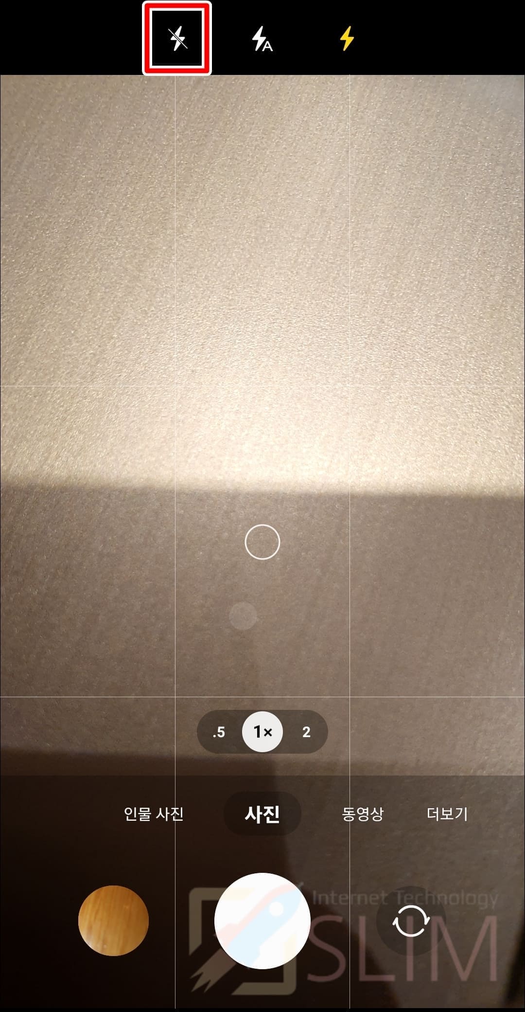 1. 갤럭시 카메라 앱에서 상단 번개 모양 플래시 버튼을 클릭합니다.
