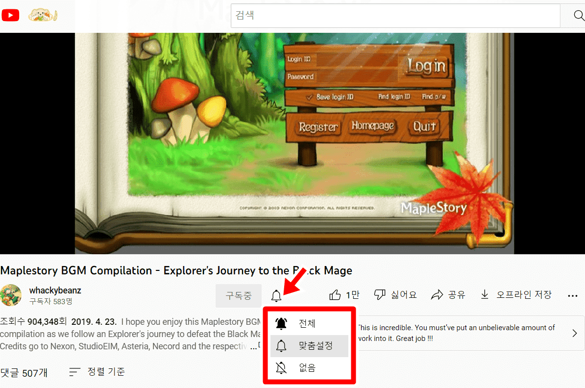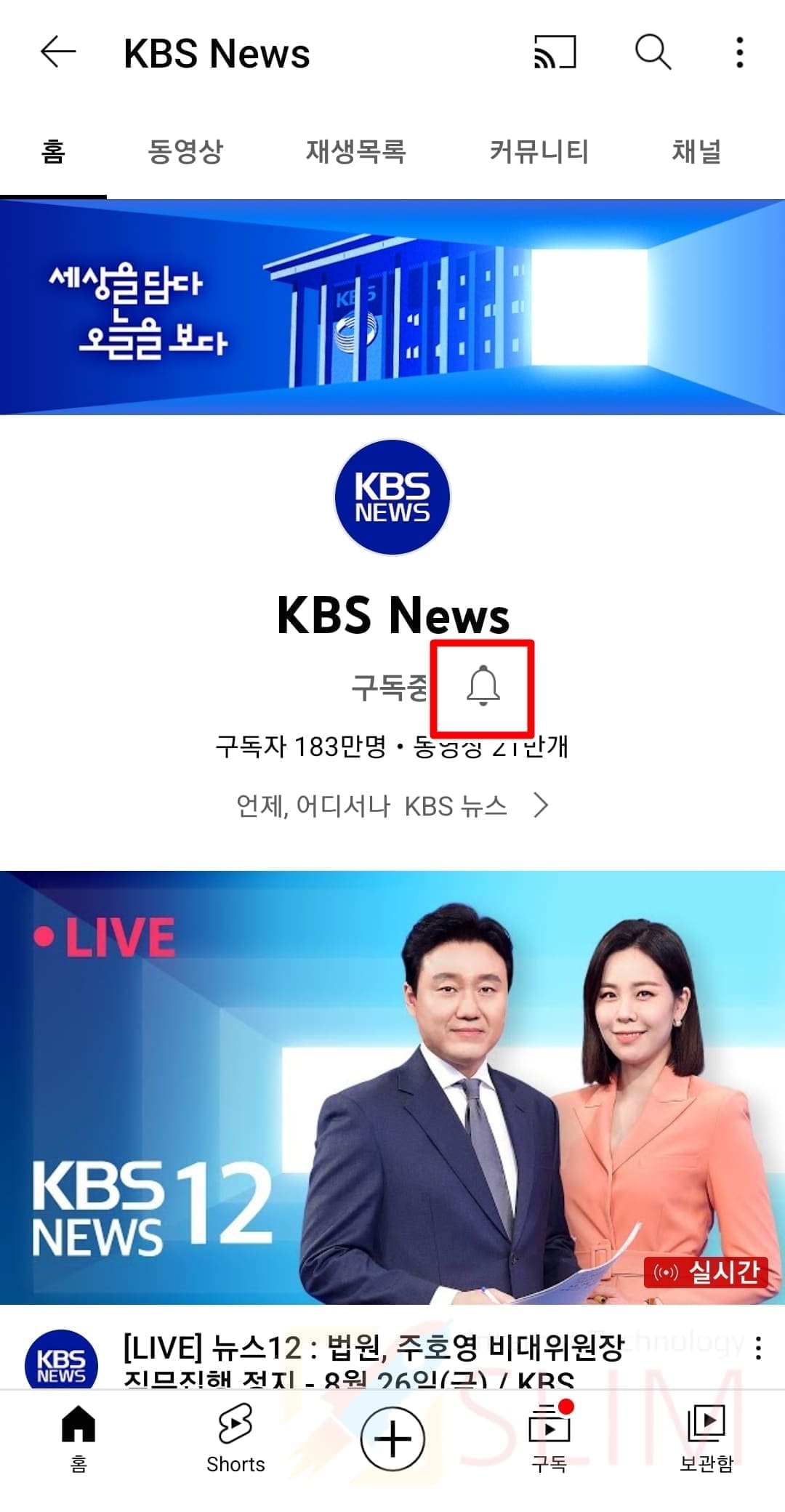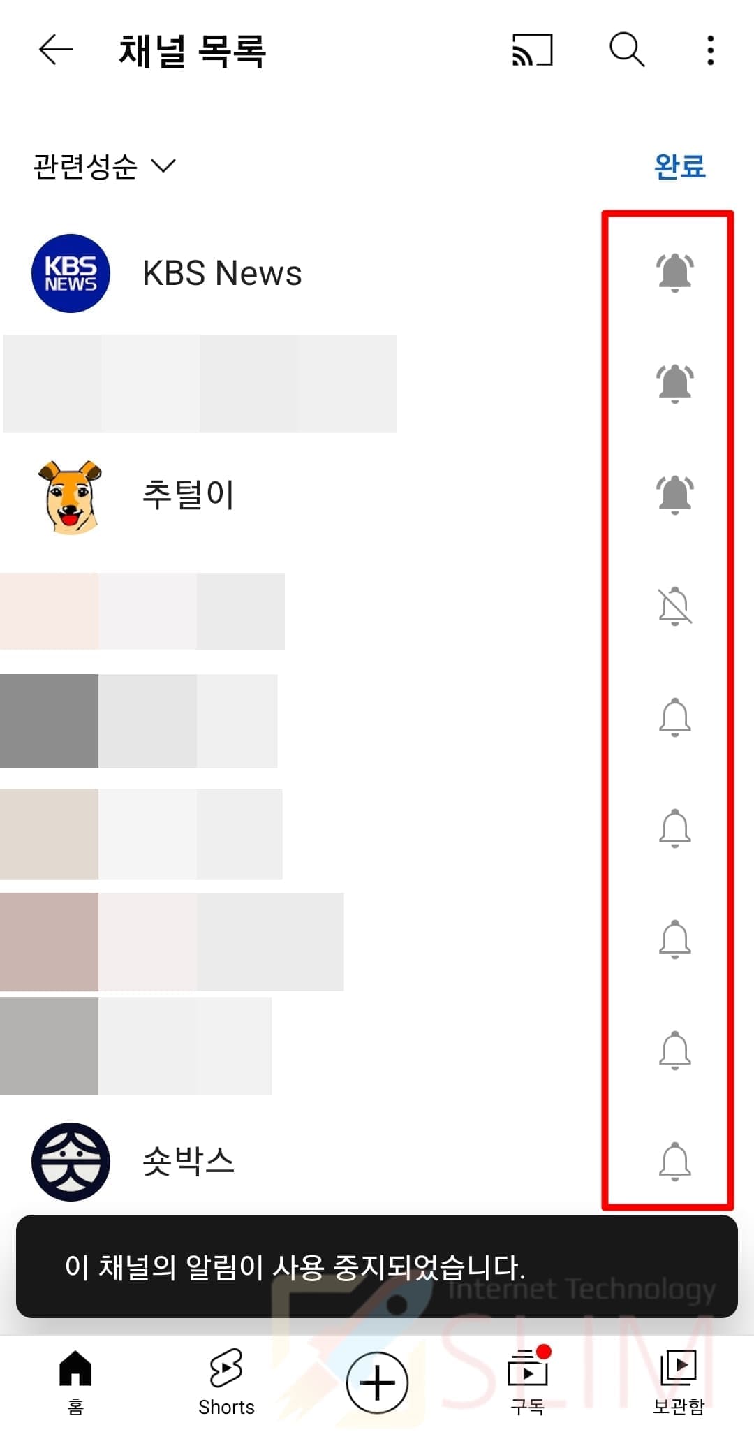 4. 구독중 문구 오른쪽의 종 모양 버튼을 누릅니다.