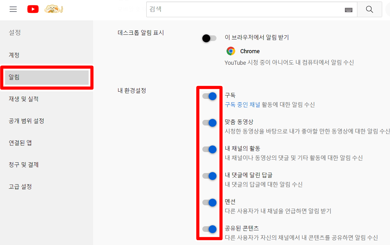참고로 PC에서 유튜브 알림이 수신되지 않는다면 위 알림 설정 화면에서 [데스크톱 알림 표시 - 이 브라우저에서 알림 받기]를 활성화해주시길 바랍니다.