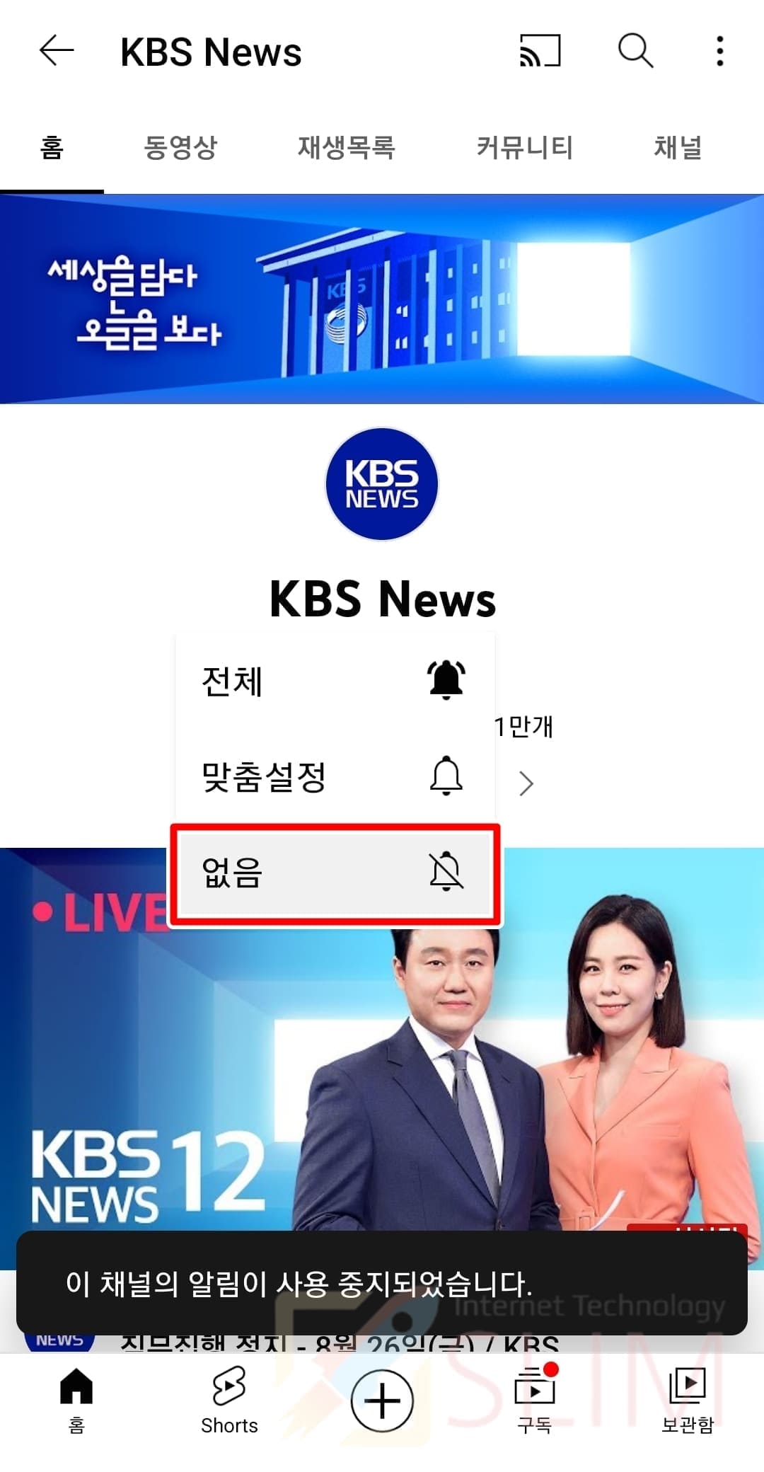 6. 모바일 유튜브 채널 알림이 설정되었습니다.