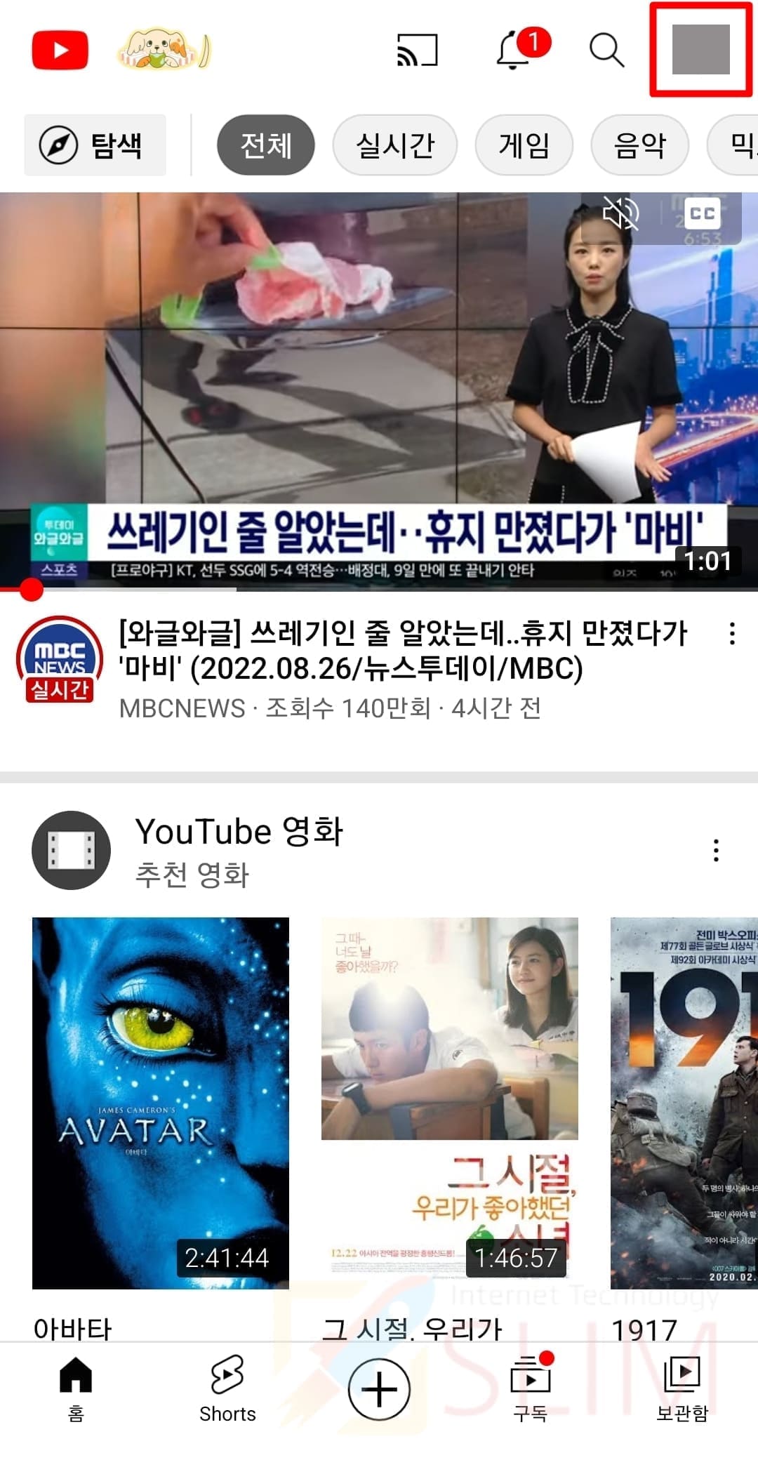 1. 유튜브 앱에서 내 프로필을 클릭합니다.