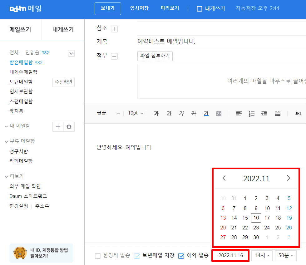 이제 작성한 다음 메일이 발송될 날짜, 시간, 분이 모두 설정되었습니다.