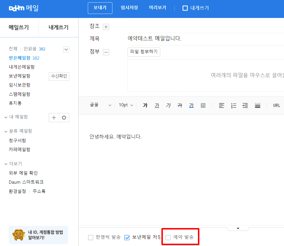 4. 메일 작성화면 아래에서 예약 발송을 체크합니다.