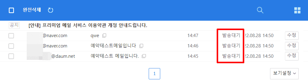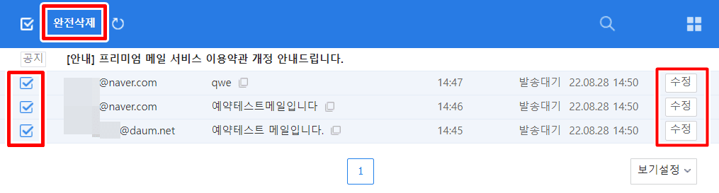 2. 발송대기중인 메일을 선택해서 삭제하거나 수정할 수 있습니다.