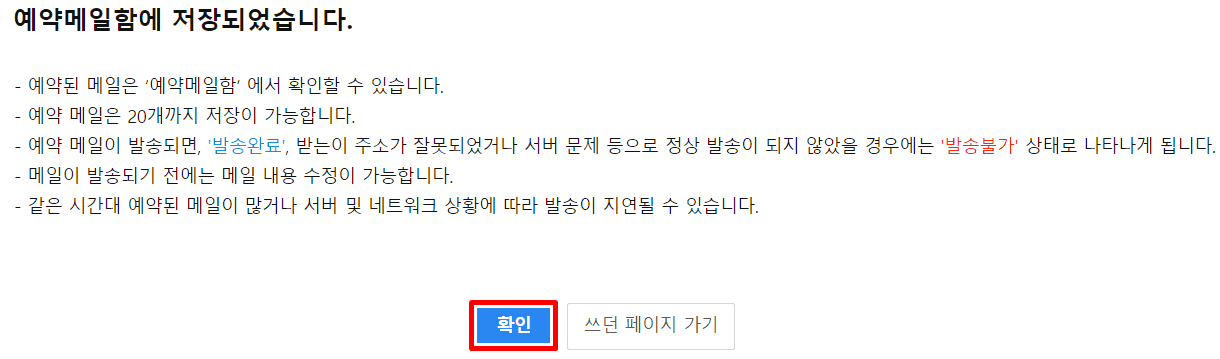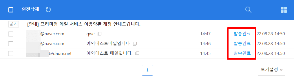 예약 메일이 전송되었다면 '발송완료' 상태로 표시됩니다. 상대방에게 성공적으로 발신됬다는 의미로 예약 메일의 수정, 삭제가 불가능합니다.